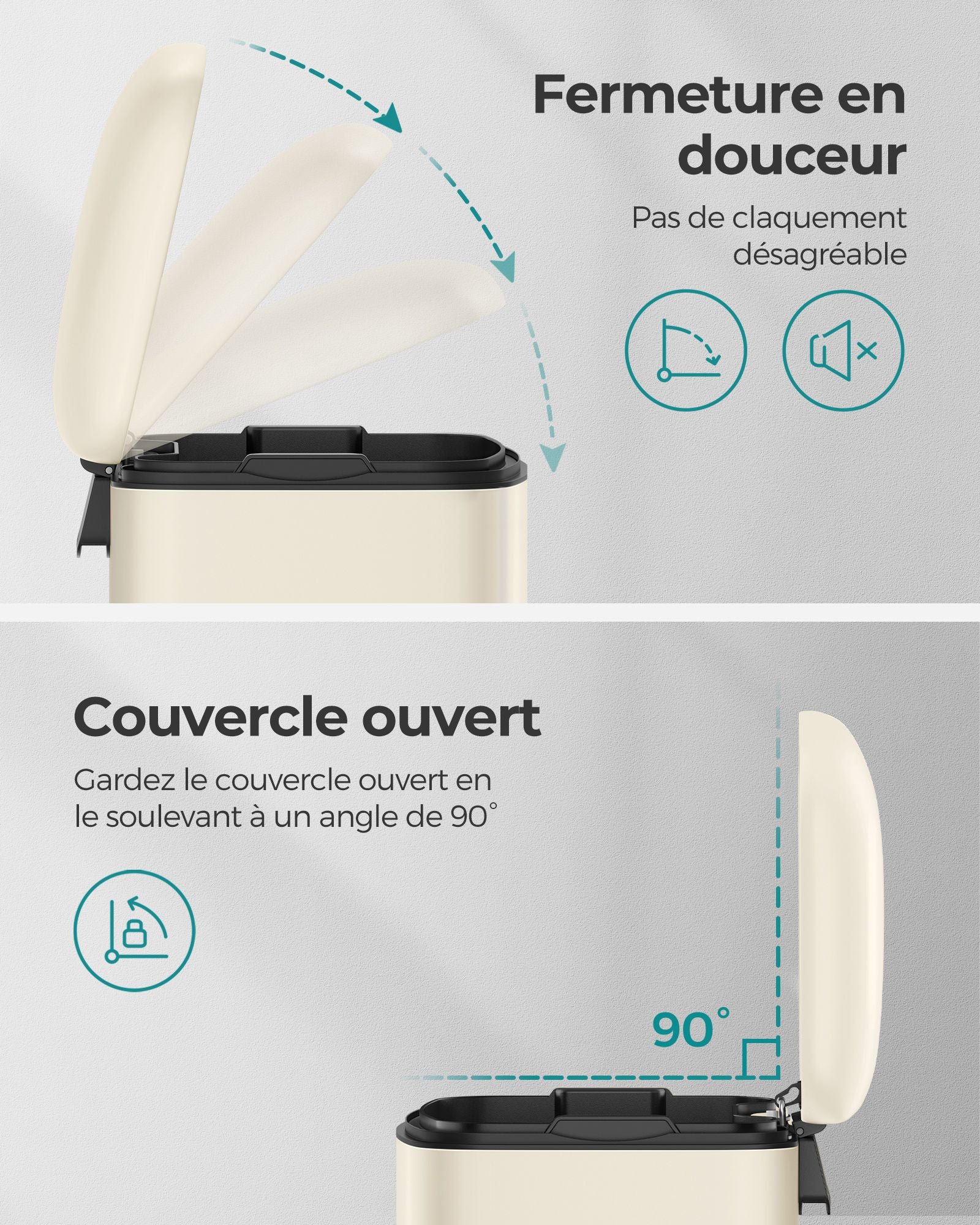 Le couvercle est équipé d’un système de fermeture douce qui se referme lentement et silencieusement, évitant tout bruit désagréable. Pour plus de praticité lors d’un grand ménage, il peut être ouvert manuellement jusqu’à un point de blocage, puis refermé d’une simple pression de la main.