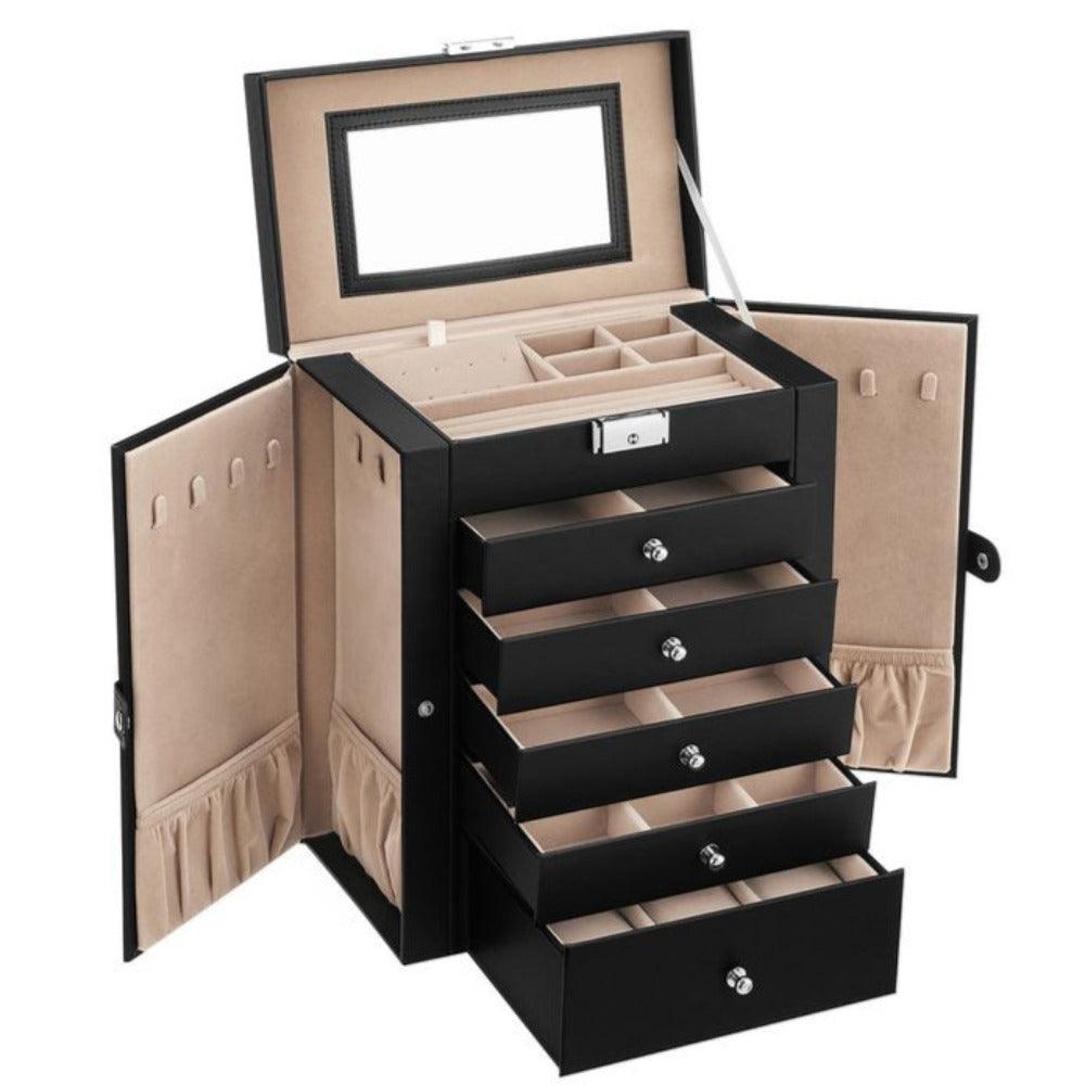 Boîte à bijoux coffre à bijoux grand 6 niveaux avec ailes tiroirs miroir et fermoir pour bracelets boucles d'oreilles bagues colliers idée cadeau 32 cm noir 12_0002126