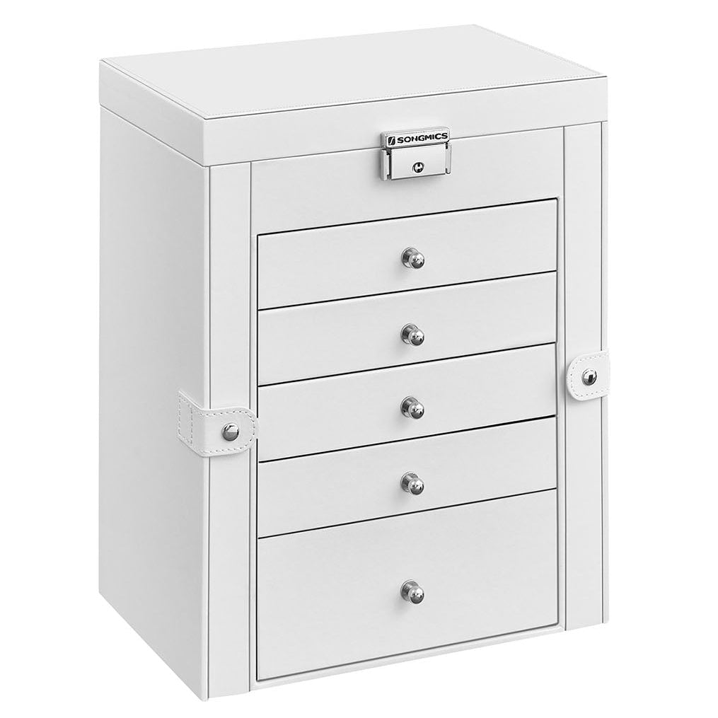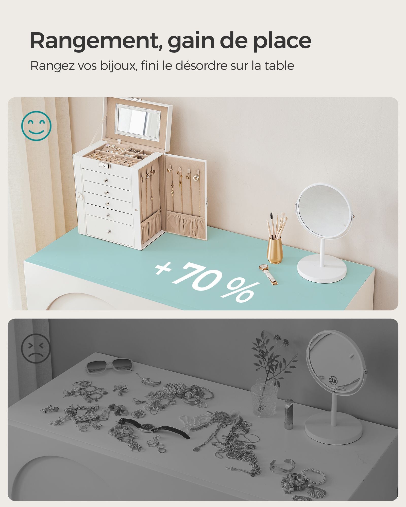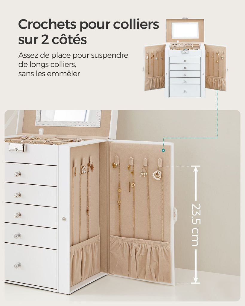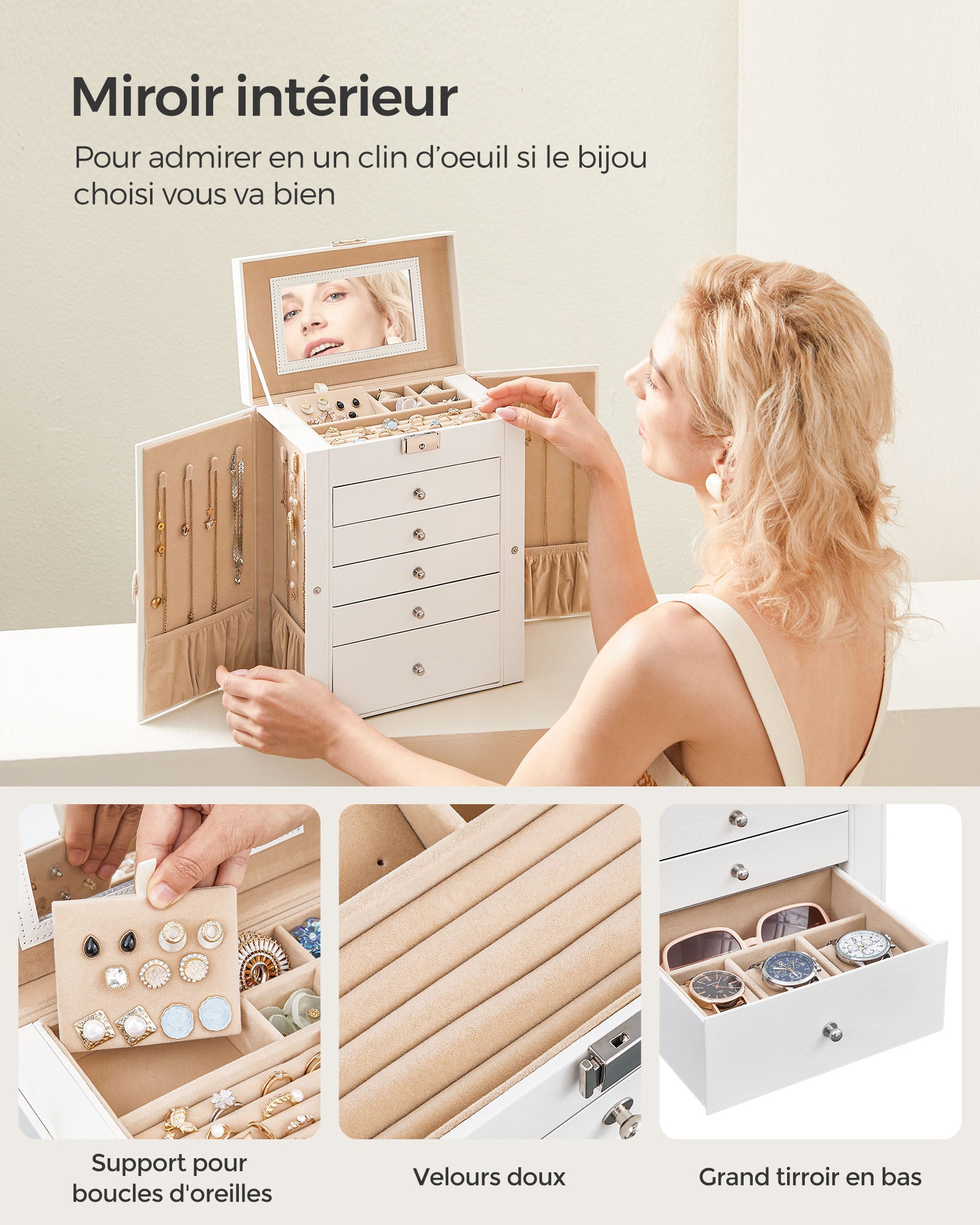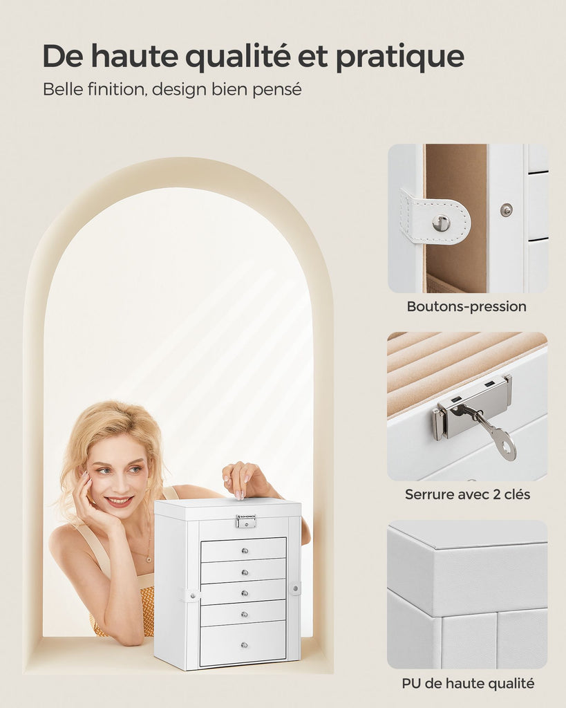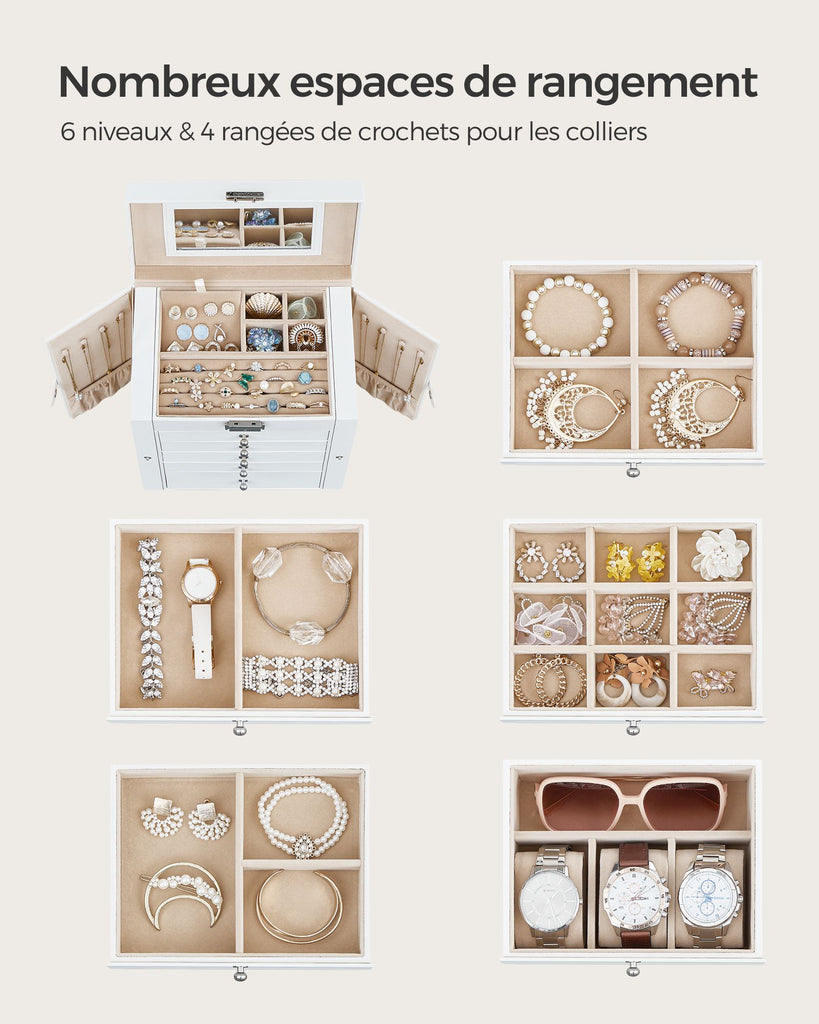 Boîte à bijoux coffre à bijoux grand 6 niveaux avec ailes tiroirs miroir et fermoir pour bracelets boucles d'oreilles bagues colliers idée cadeau blanc 12_0004306