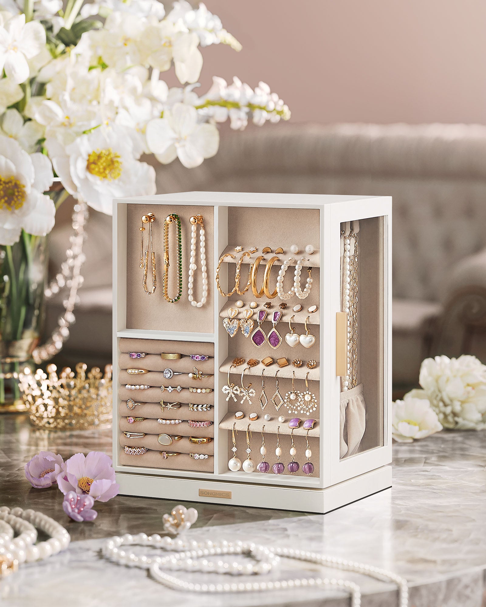 Boîte à bijoux rotative à 360° coffret à bijoux avec 5 tiroirs fenêtres en verre latérales grand rangement pour accessoires design ouvert 12_0004348