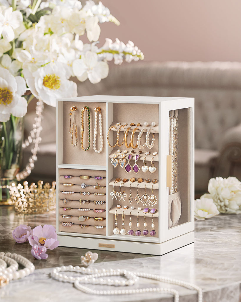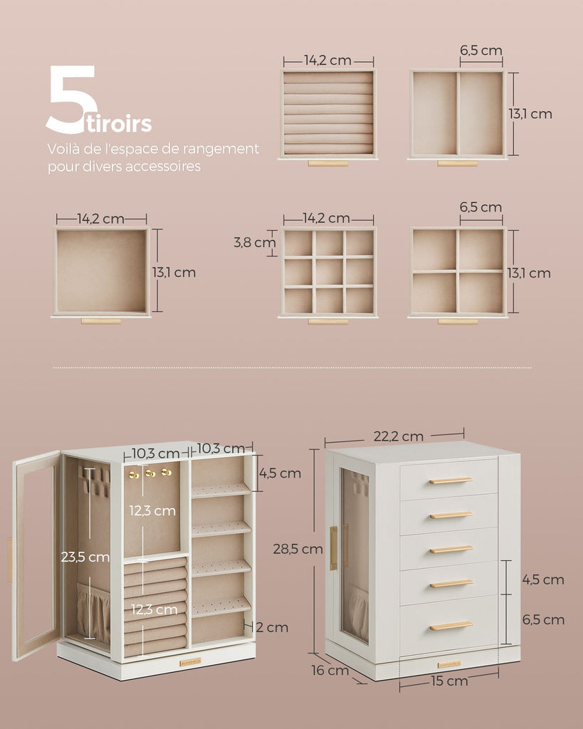 16 x 22,2 x 28,5 cm, ce présentoir convient à de nombreux bijoux. À l’avant : emplacements pour bagues, bracelets et boucles d’oreilles ; à l’arrière : 5 tiroirs pour broches et accessoires ; sur les côtés : 18 crochets pour colliers.