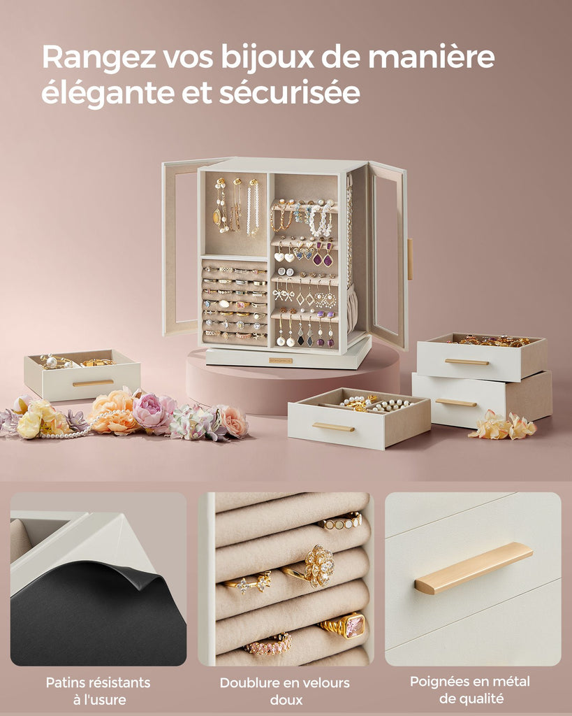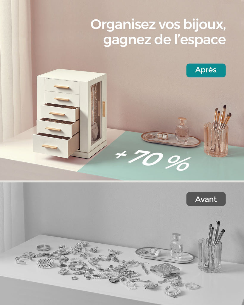 Rotation à 360°, rangement vertical, conception ouverte – avec cette boîte à bijoux, vous pouvez présenter et ranger vos bijoux. Vous trouvez rapidement et simplement le bijou dont vous avez besoin !