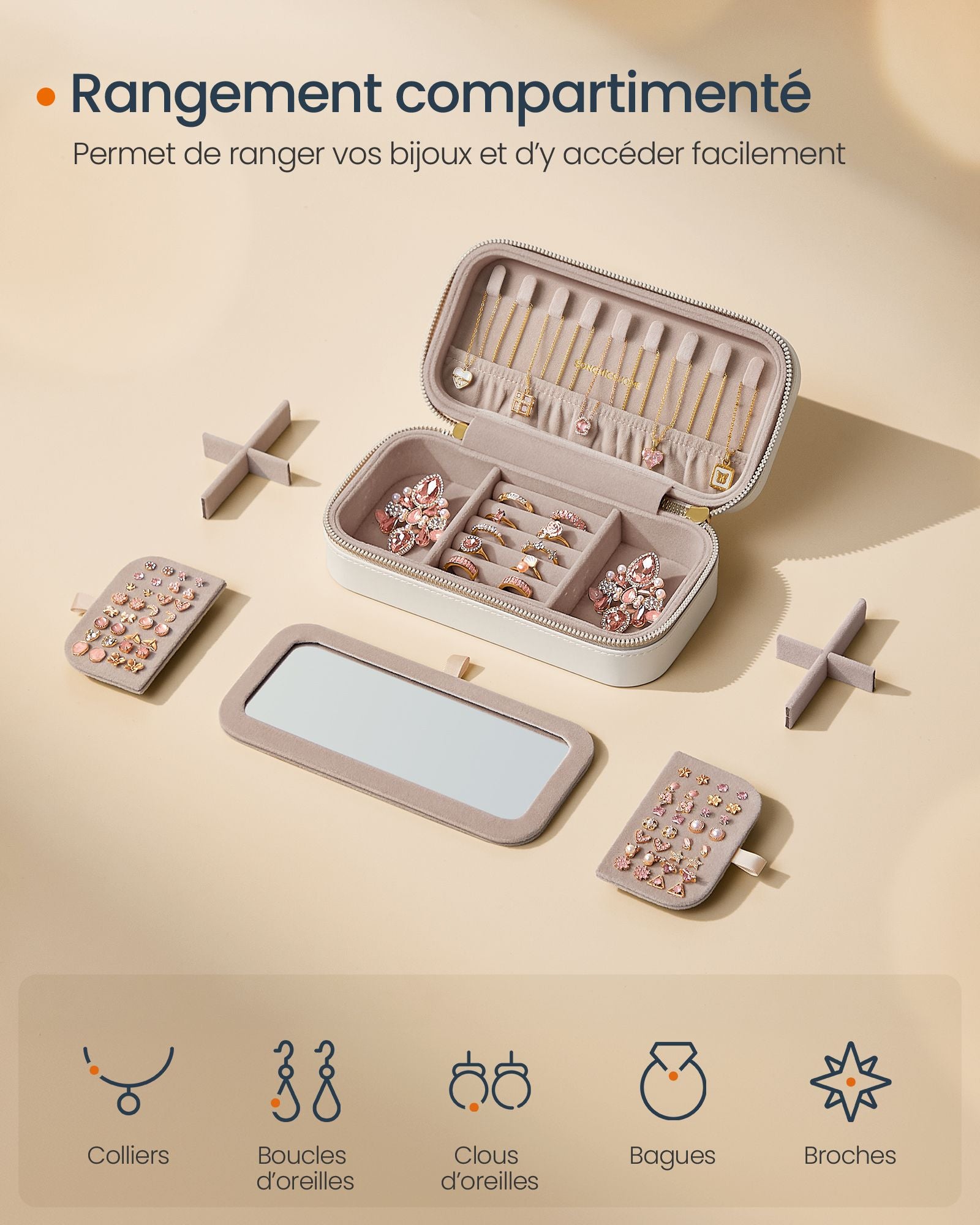 L’intérieur bien agencé propose des compartiments modulables, des fentes pour bagues, un espace dédié aux colliers et deux plateaux amovibles pour les boucles d’oreilles. Vos bijoux restent ainsi organisés, sans nœuds ni rayures.