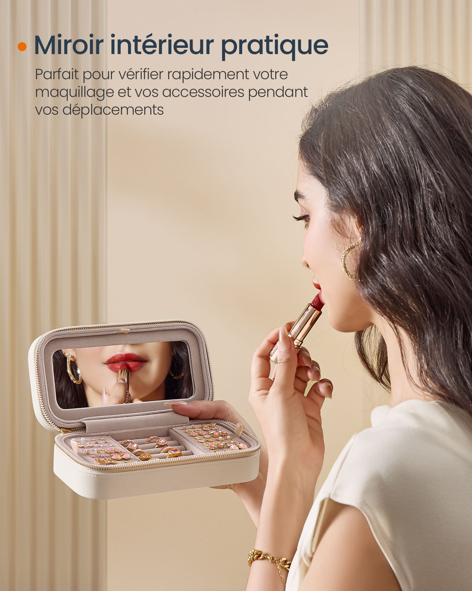 Compacte et pratique (10,5 x 20,5 x 6 cm), elle se glisse facilement dans un sac ou une valise, idéale pour voyager avec vos bijoux préférés. Elle est équipée d’un miroir pour des retouches maquillage rapides et de fermetures zippées pour une ouverture simple et sécurisée.