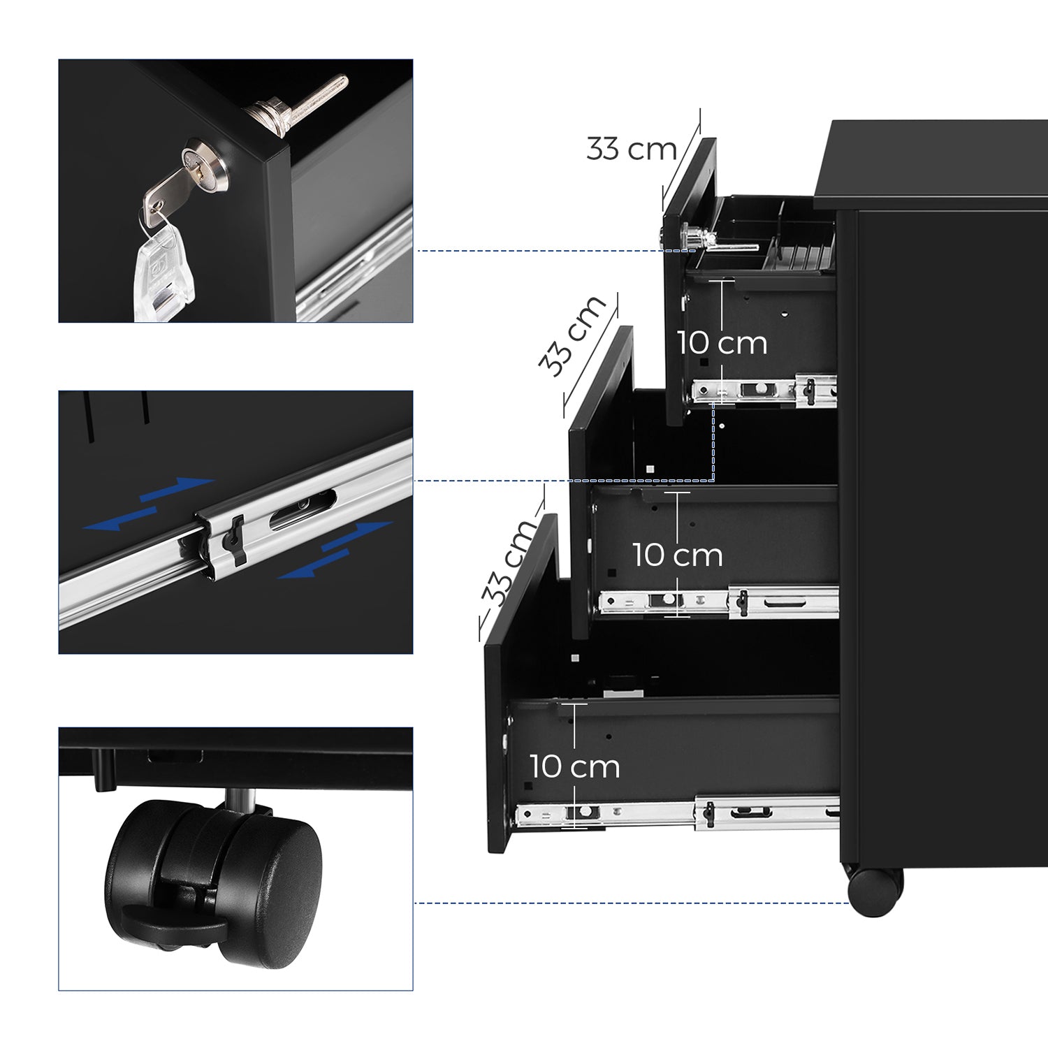 Caisson armoire de bureau mobile verrouillable avec 3 tiroirs rangement de documents papeterie préassemblé pour bureau bureau à domicile 39 x 45 x 55 cm noir mat 12_0004819