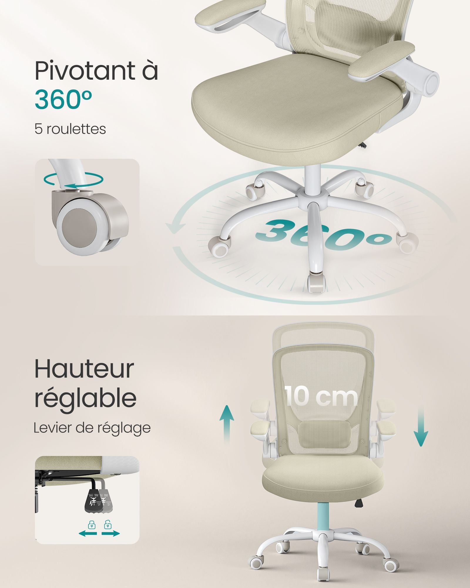 Fauteuil de bureau avec accoudoir rabattable chaise de bureau en toile siège pivotant à 360° support lombaire réglable gain de place beige 12_0005867