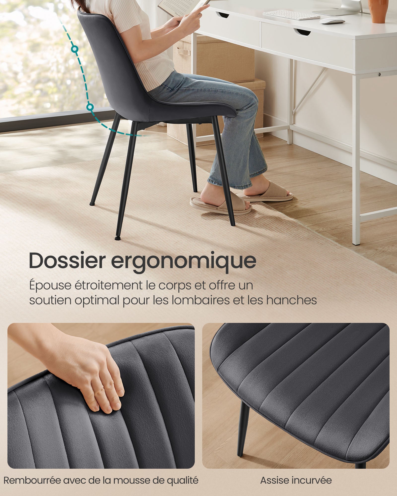Avec leur revêtement gris élégant et leurs pieds en métal noir, ces chaises au design moderne s’intègrent harmonieusement dans différents styles d’intérieur et apportent une touche contemporaine à votre salle à manger.
