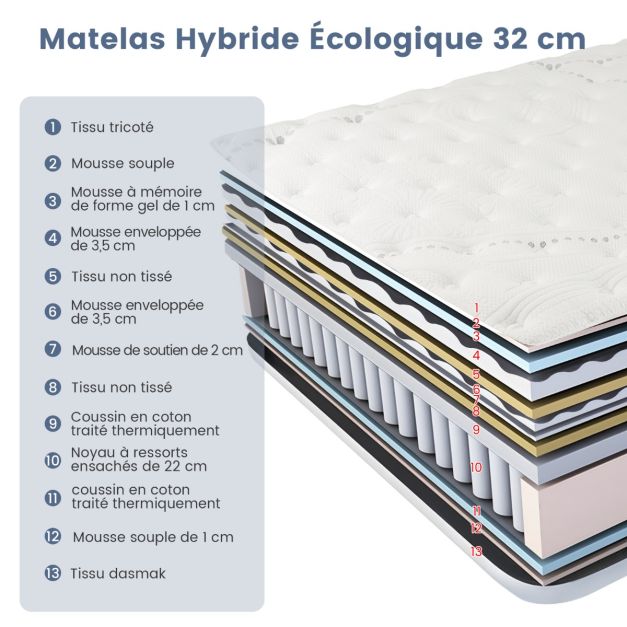 Matelas 140x200 cm de 32 cm d’épaisseur matelas hybride infusé de gel frais h2 avec soutien à 7 zones mousse à mémoire 20_0007357