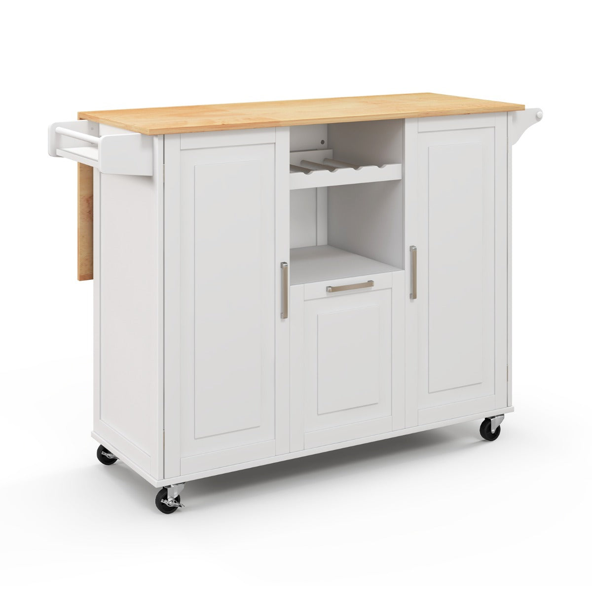 Chariot de cuisine roulant 130 x 74 x 90 cm espace de rangement ample et comptoir rabattable en bois d'hévéa blanc 20_0018047