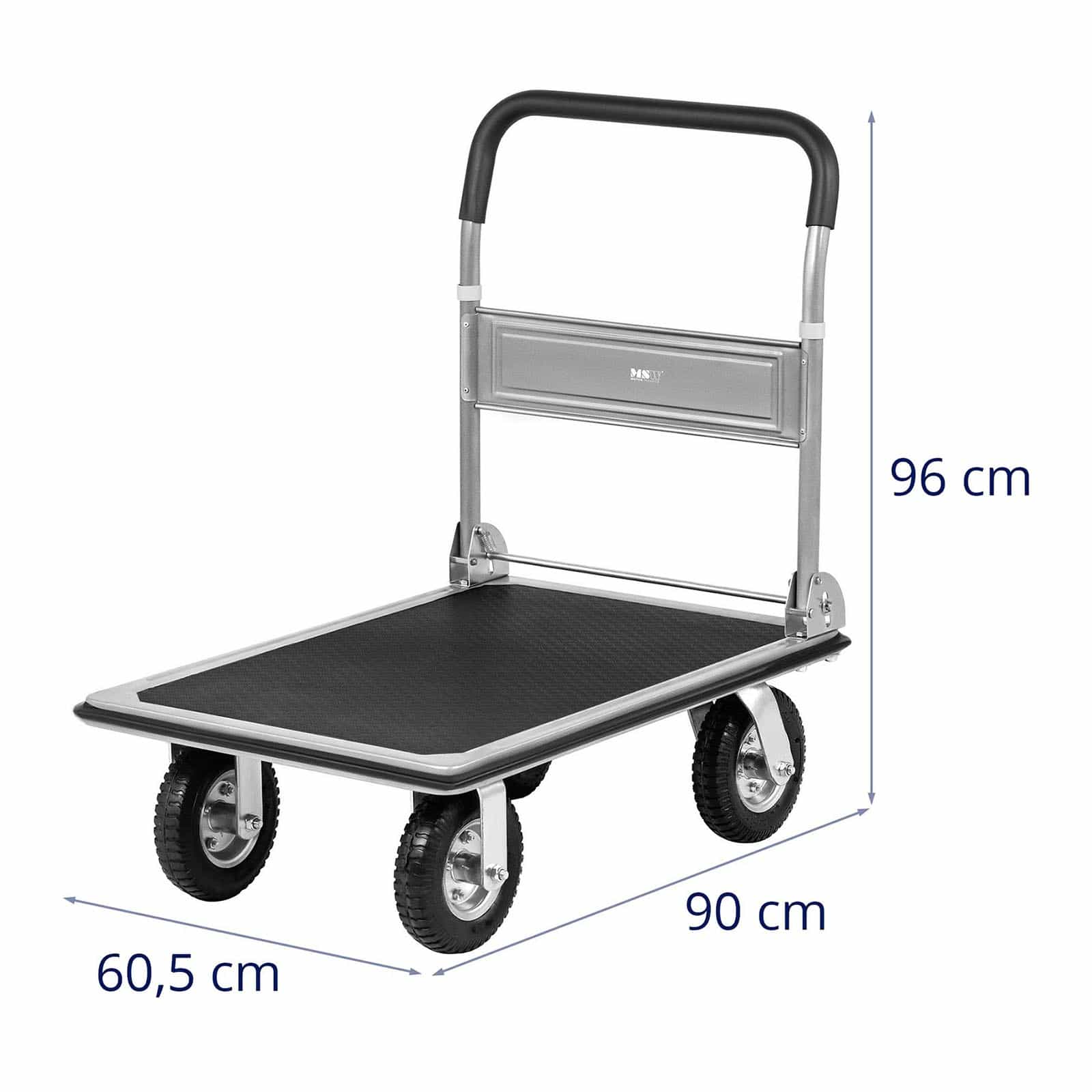 La surface de chargement de ce chariot à plateau mesure 80 x 60 cm et elle peut supporter sans problème un maximum de 300 kg.