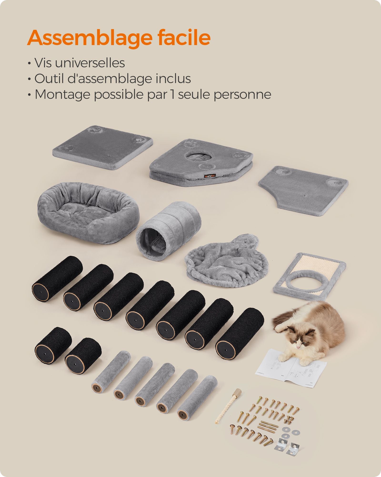 Que ce soit un Ragdoll musclé ou un grand Savannah, la sécurité est toujours prioritaire. La base est renforcée par une double couche de panneaux d’aggloméré, des dispositifs anti-basculement sont fournis, et les troncs épais en sisal de 8,6 cm de diamètre assurent une excellente stabilité.