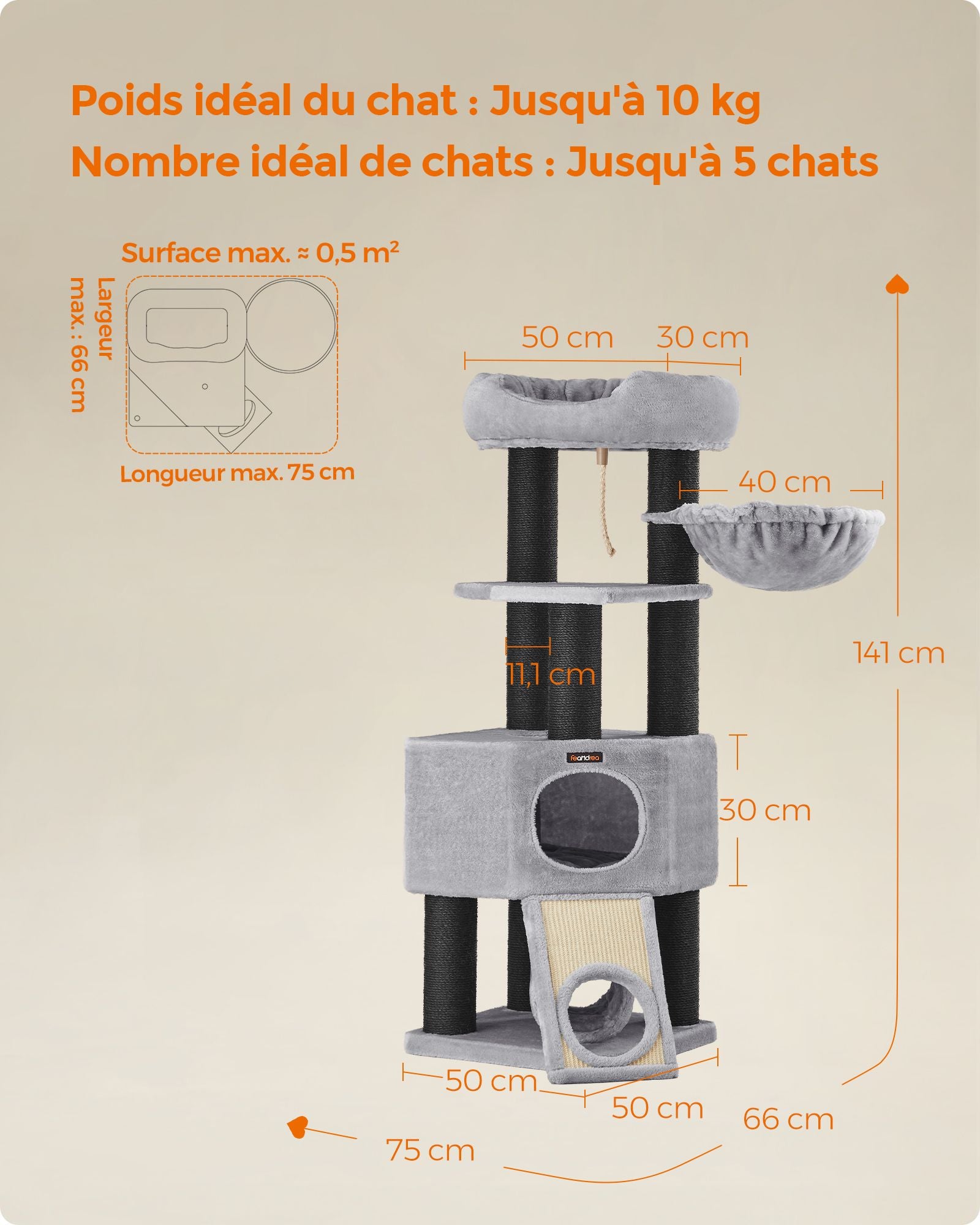 Arbre à chat 50 x 50 x 141 cm avec plate-forme d'observation hamac grande grotte tunnel troncs épais en sisal noir stable confortable gris clair 12_0003813