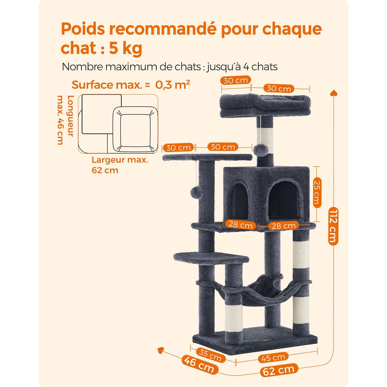 Cet arbre à chat offre un espace de jeu et de repos parfaitement adapté aux familles ayant plusieurs chats. Il est équipé de 2 plateformes avec rebords rembourrés et d’une niche confortable, permettant à vos compagnons de grimper, observer et se détendre en toute tranquillité.