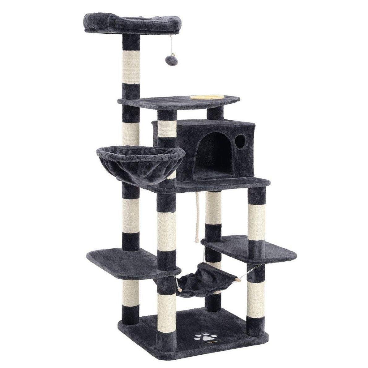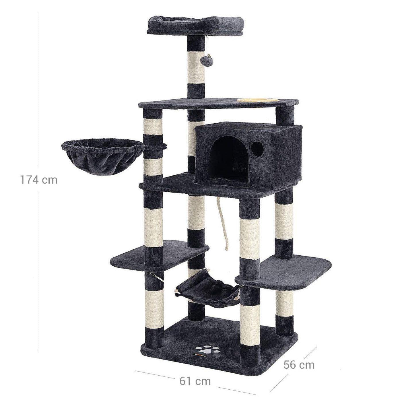 Arbre à chat hauteur de 174 cm multi-niveaux avec bol panier niche maison de jeu meubles pour chatons chats et félins couleur grise cendrée 12_0001180