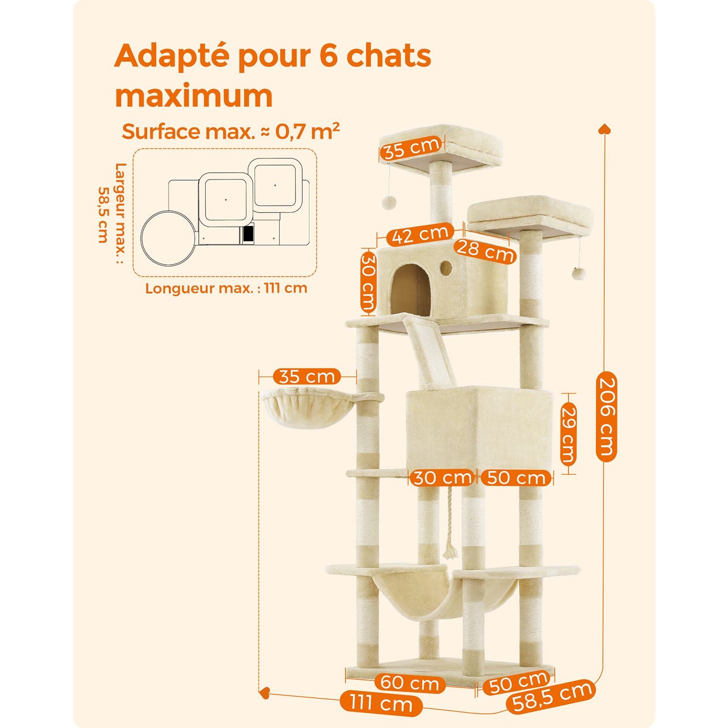 Cet arbre à chat impressionne par sa hauteur de 206 cm et ses 5 niveaux espacés de 30 à 40 cm, offrant à vos compagnons félins un terrain de jeu vertical riche et stimulant. Monter, descendre, grimper et explorer deviennent un véritable plaisir au quotidien.