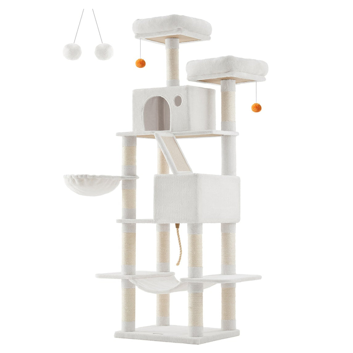 Pensée pour les foyers avec plusieurs chats, cette tour multifonction propose de nombreuses zones de détente et de jeu : 2 plateformes rembourrées pour observer en hauteur, 2 niches cosy pour se cacher, 1 panier moelleux, 1 hamac accueillant, 2 pompons ludiques et même une corde de jeu. De quoi satisfaire la curiosité et l’énergie de vos petits félins.