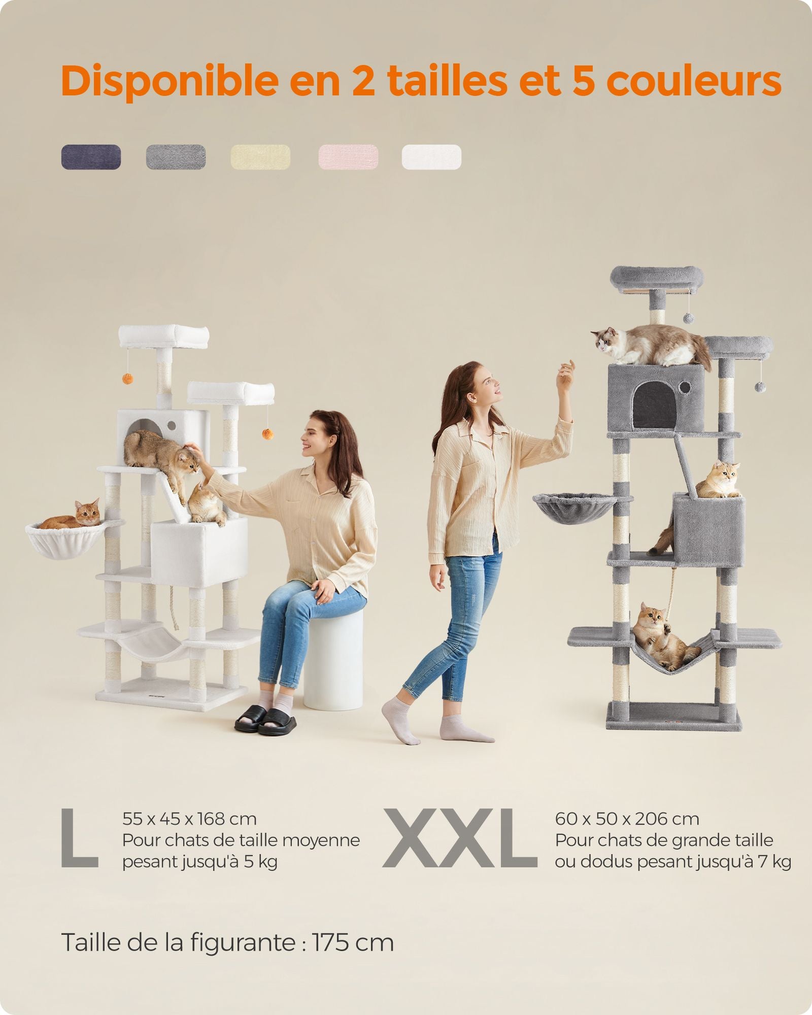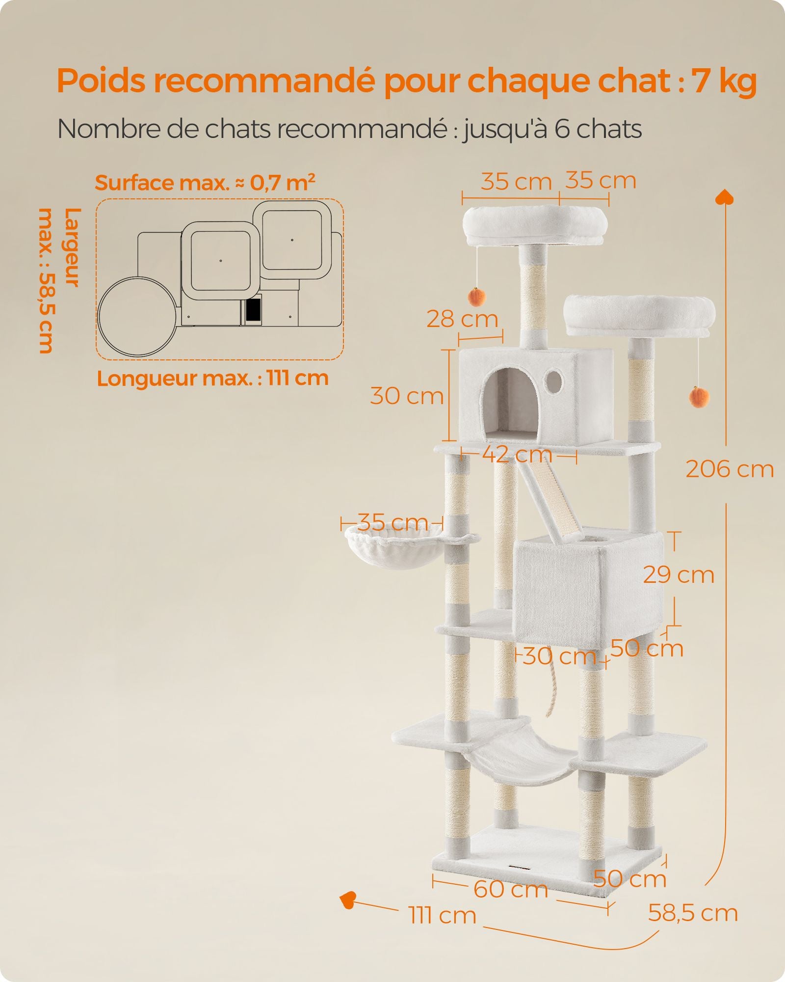 Avec ses 206 cm de hauteur et ses 5 niveaux espacés de 30 à 40 cm, cet arbre à chat est un véritable terrain d’aventure pour les félins amateurs d’escalade et de points en hauteur. Vos compagnons pourront grimper, observer et se reposer à volonté.