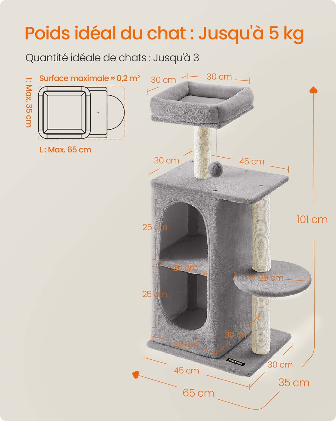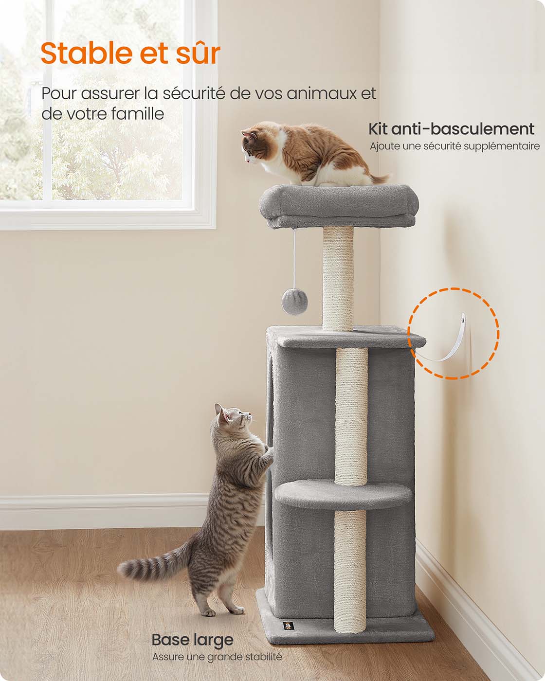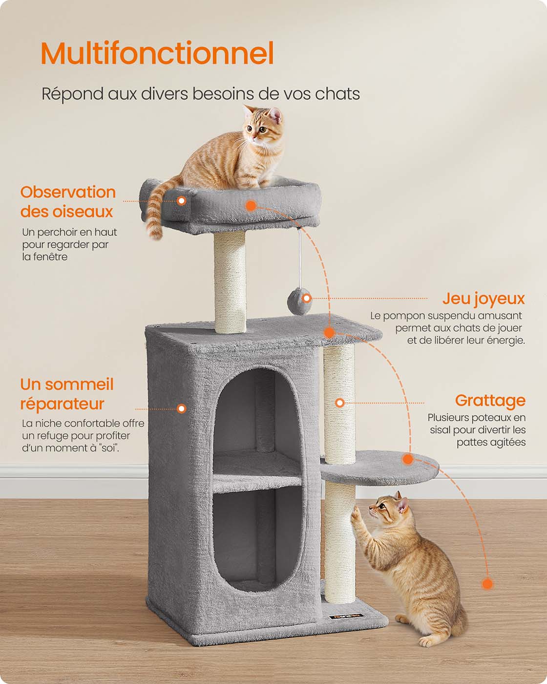Les poteaux recouverts de sisal permettent aux félins de satisfaire leur instinct naturel de griffade, protégeant ainsi vos meubles. Le perchoir supérieur leur offre un poste d’observation parfait près d’une fenêtre, pour des heures d’exploration et de détente.