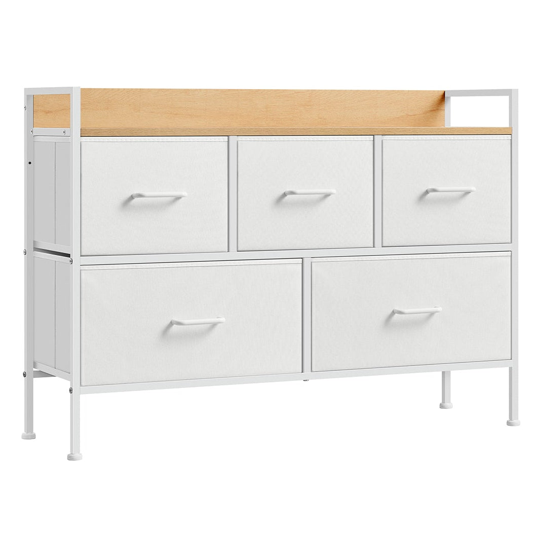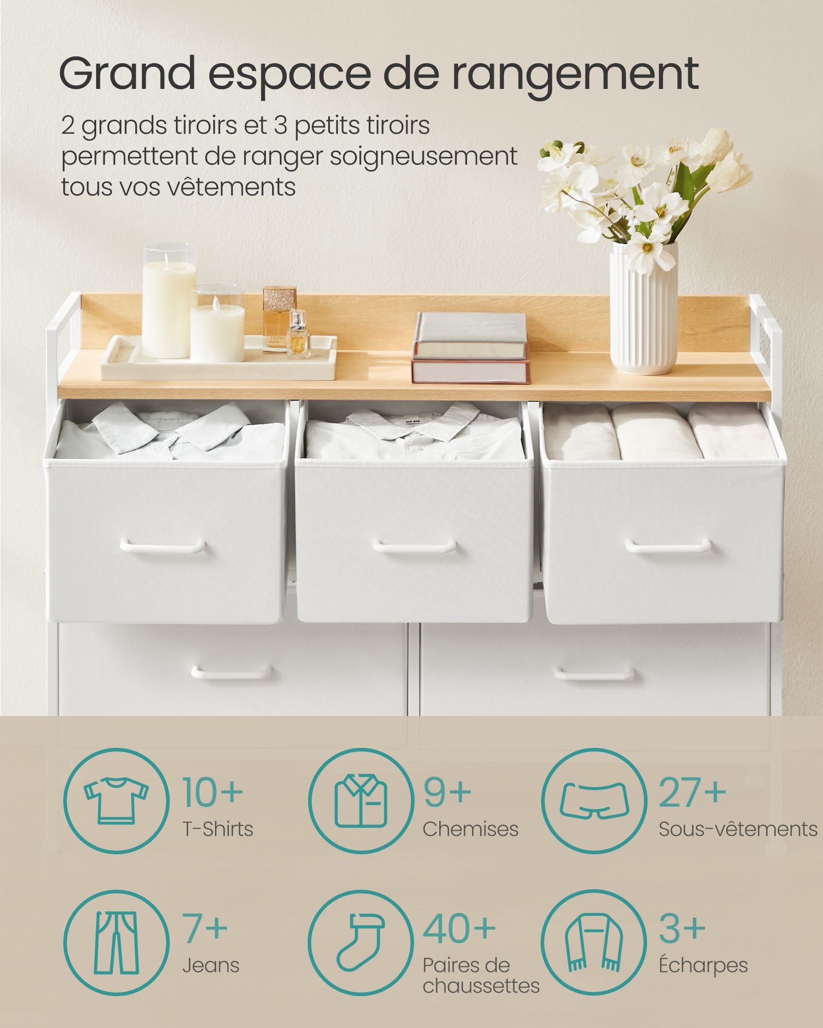 Avec ses cinq tiroirs, dont deux grands et trois petits, cette commode offre un espace de rangement bien organisé pour trier et classer vos affaires par catégorie. Les grands tiroirs peuvent contenir 60 à 70 paires de chaussettes, 13 à 16 T-shirts ou 7 à 11 pantalons, tandis que les petits accueillent 40 à 45 paires de chaussettes, 9 à 10 T-shirts ou 4 à 7 pantalons.