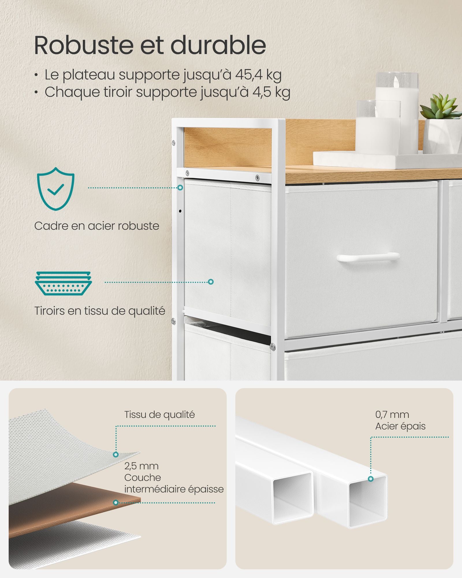 Commode en tissu meuble de rangement avec 7 tiroirs à 3 niveaux avec poignées en métal style industriel blanc 12_0005210