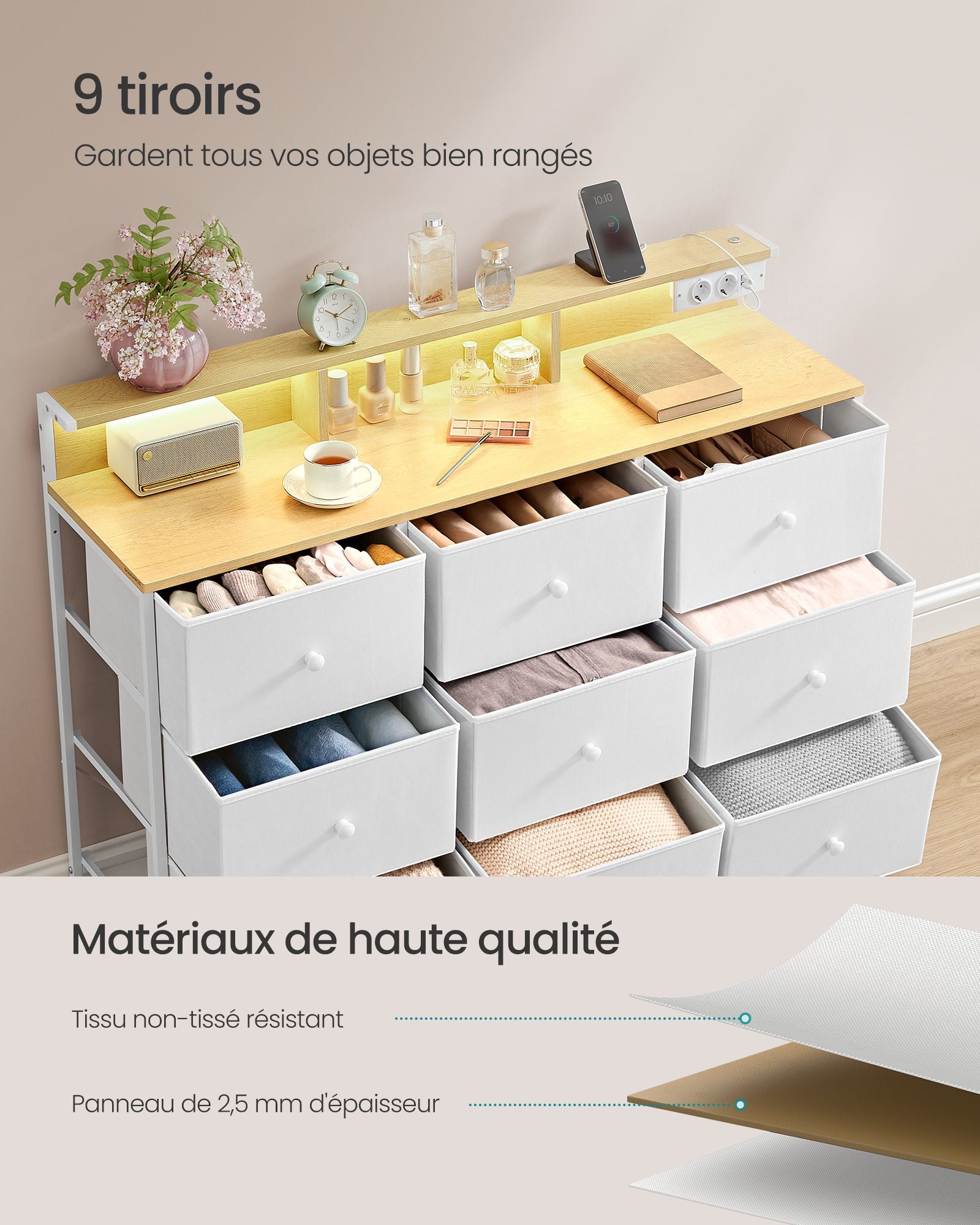 Commode meuble de rangement avec 9 tiroirs et éclairage led multiprise cadre en acier 335 x 114 x 84 cm pour chambre salon blanc nuage 12_0005214