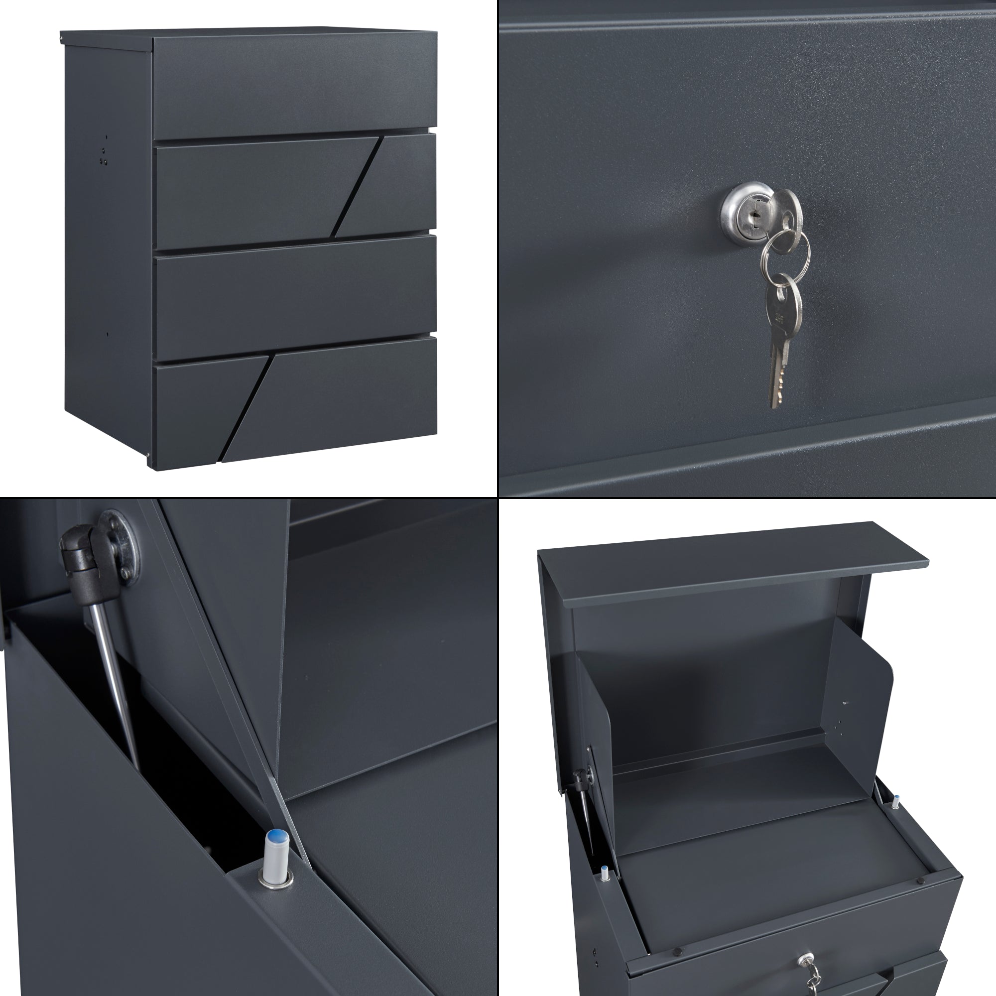 Notre spacieuse boîte aux lettres est parfaite pour recevoir vos courriers, magazines et même les petits colis grâce à son compartiment spécialement conçu pour les paquets. Son fonctionnement ingénieux garantit la sécurité de vos colis et courriers jusqu'à votre retour. L'accès au compartiment inférieur est simple grâce aux deux clés fournies. La boîte aux lettres peut être fixée au mur à l'aide du matériel fourni. Avec son design moderne et élégant, elle deviendra la solution pratique et stylée pour votre entrée.
