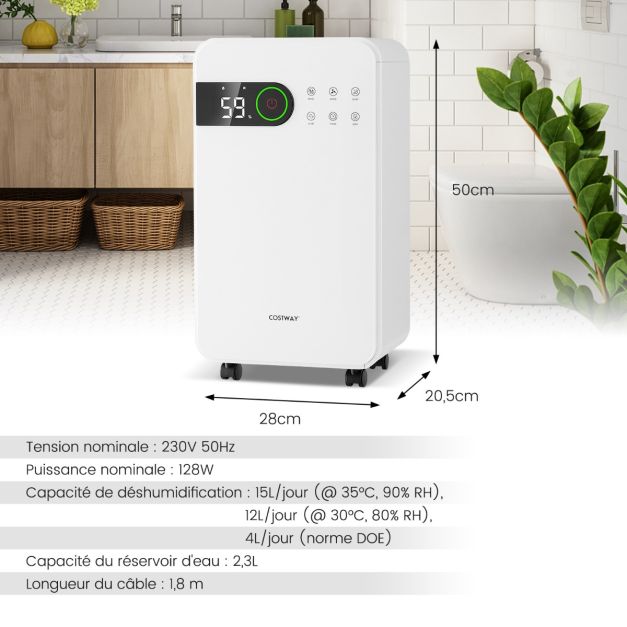 Capacité de déshumidification : 15 L/jour (35℃, 90 % d'humidité relative), 12 L/jour (30℃, 80 % d'humidité relative), 4 L/jour (norme DOE)