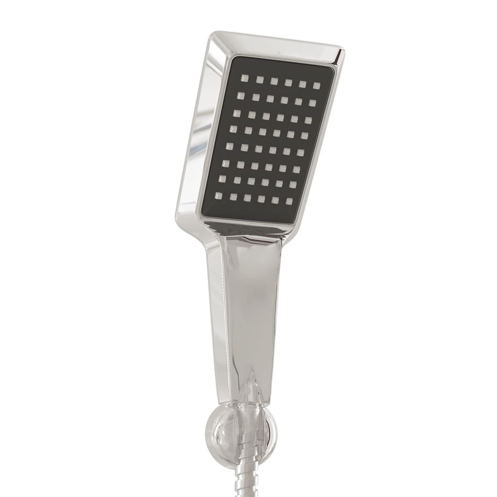La pomme de douche à effet pluie, les jets de massage, la pomme de douche à main et les boutons sont chromés