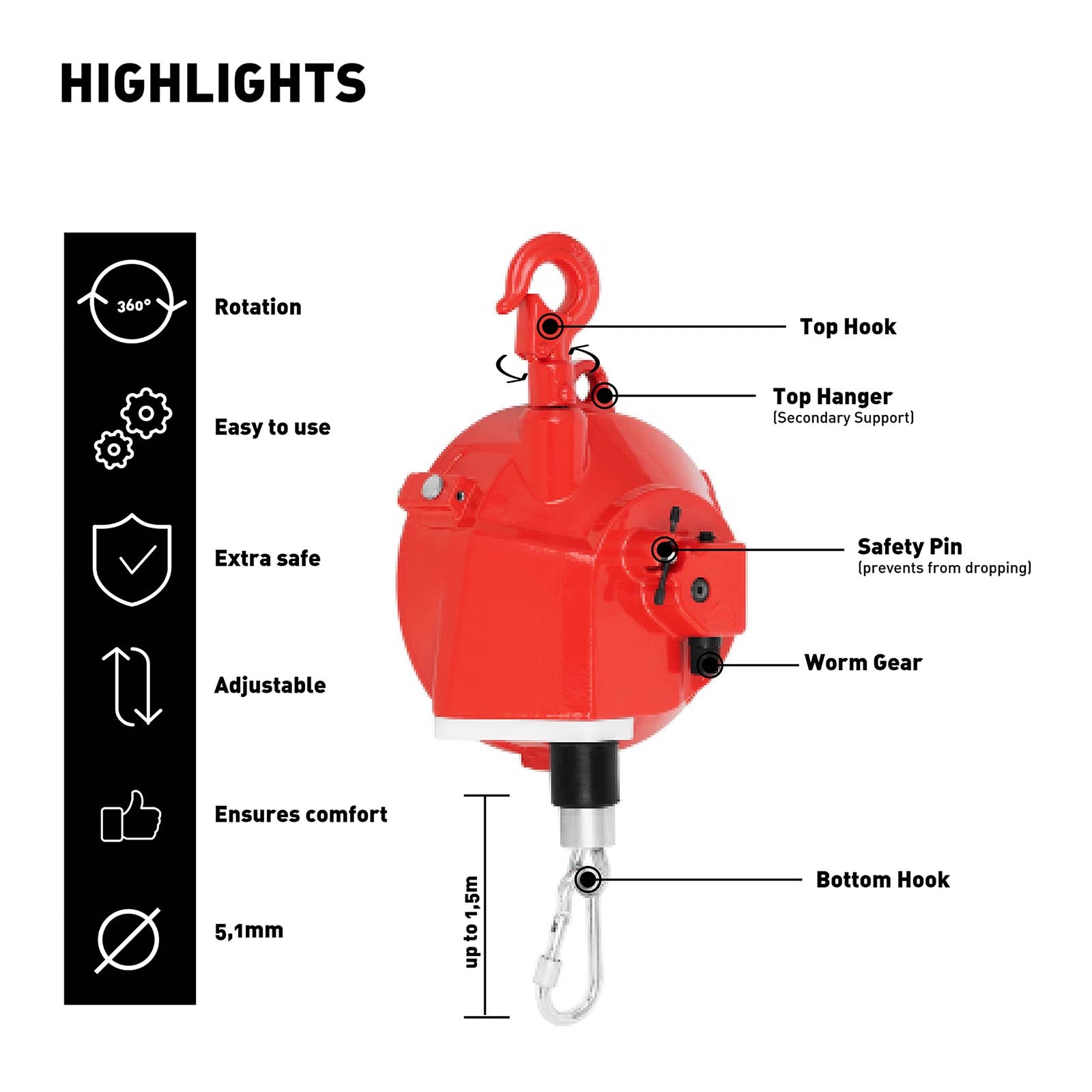Cet équilibreur de charge à ressort agit comme une main supplémentaire qui vous aide à soulever et à manier les outils lourds.