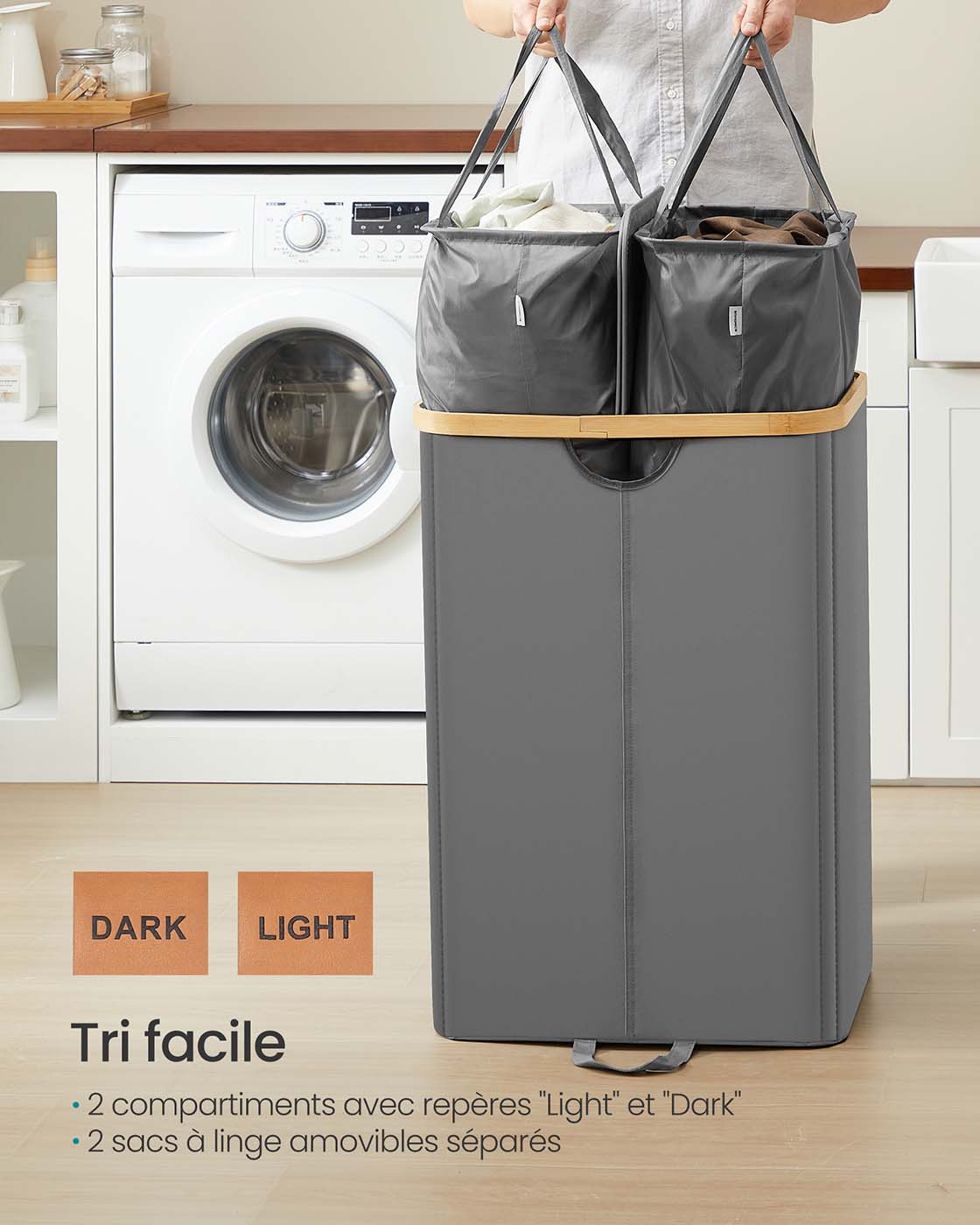 Grâce à ses deux compartiments équipés de poignées en PU avec repères “Light” et “Dark” le tri du linge par couleur devient simple et rapide Les sacs intérieurs sont amovibles et peuvent être retirés facilement en appuyant avec le pied sur la boucle située en bas Vous pouvez ensuite les transporter directement à la machine à laver grâce aux poignées latérales pratiques