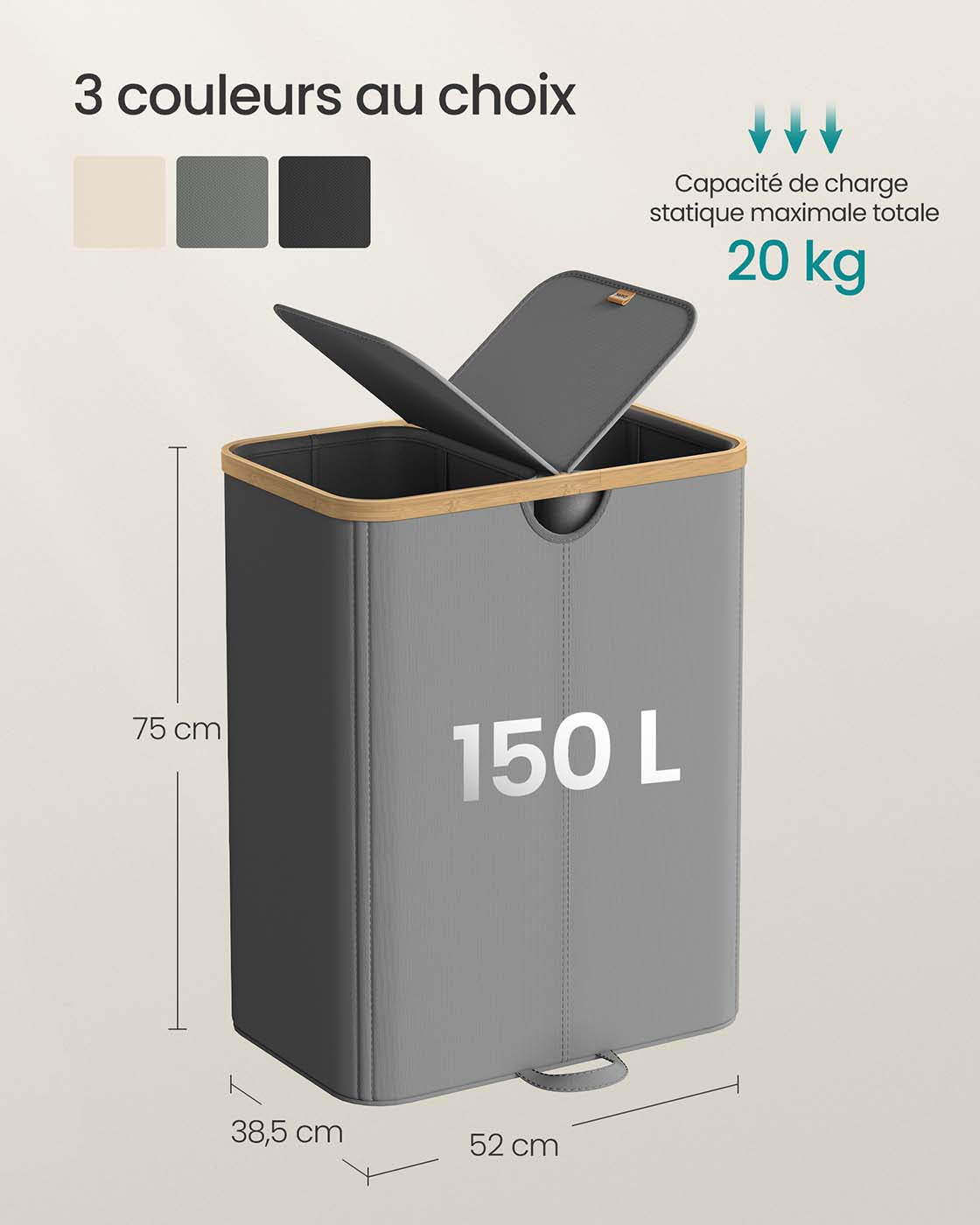 Ce panier à linge de 150 L est à la fois spacieux et élégant Il peut contenir le linge d’une semaine pour deux personnes tout en apportant une touche raffinée à votre intérieur Son couvercle symétrique garde le linge hors de vue retient les mauvaises odeurs et contribue à maintenir une pièce bien ordonnée