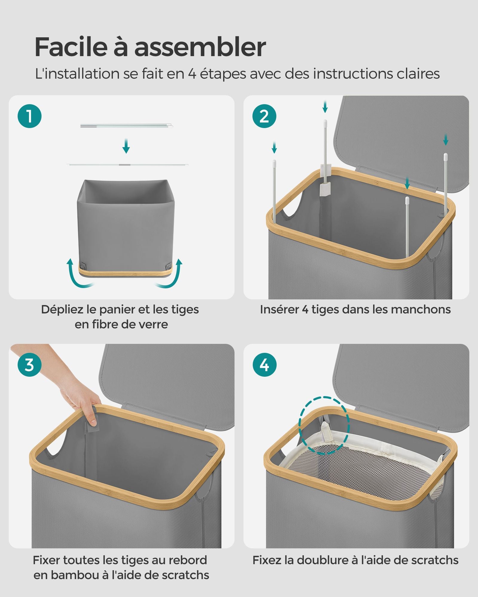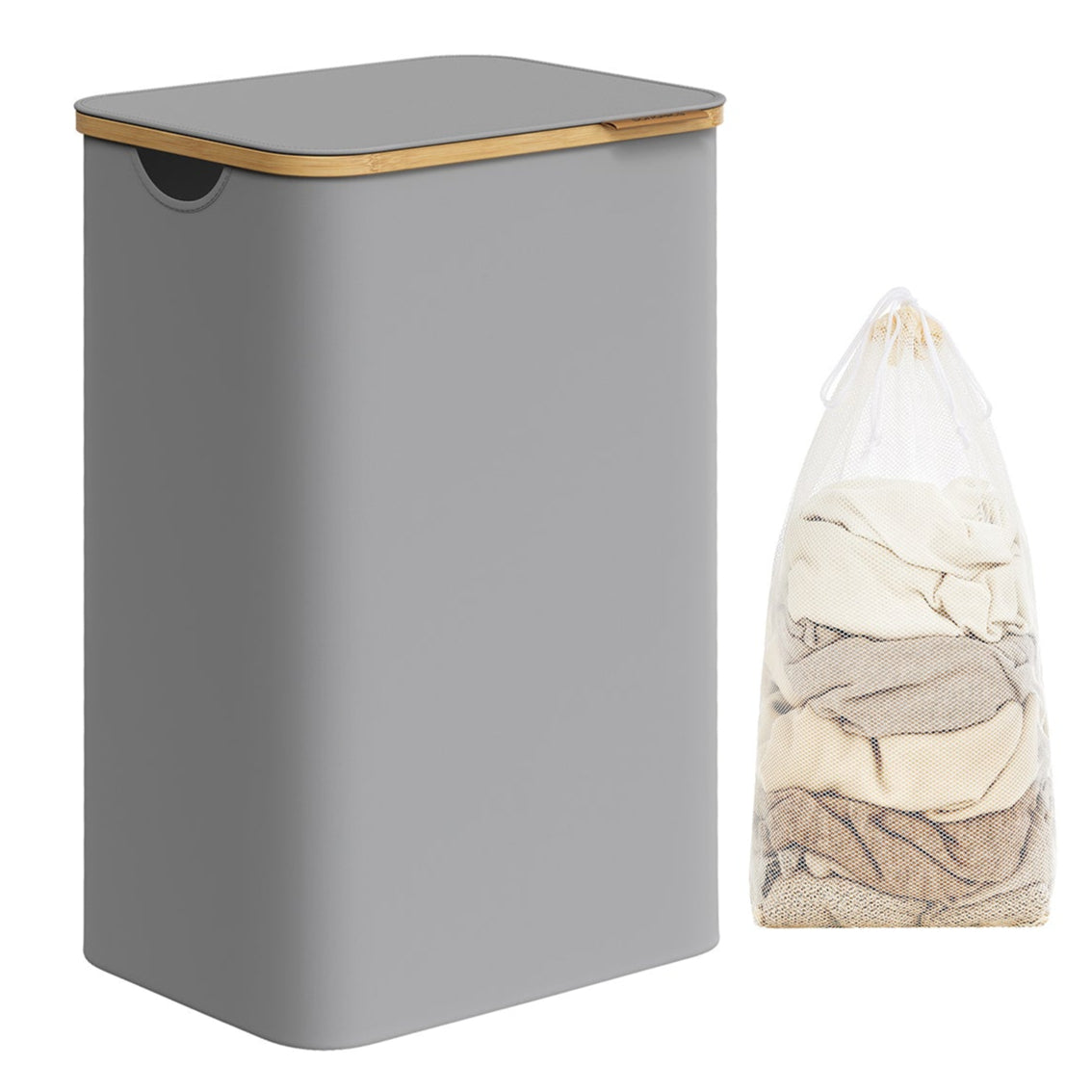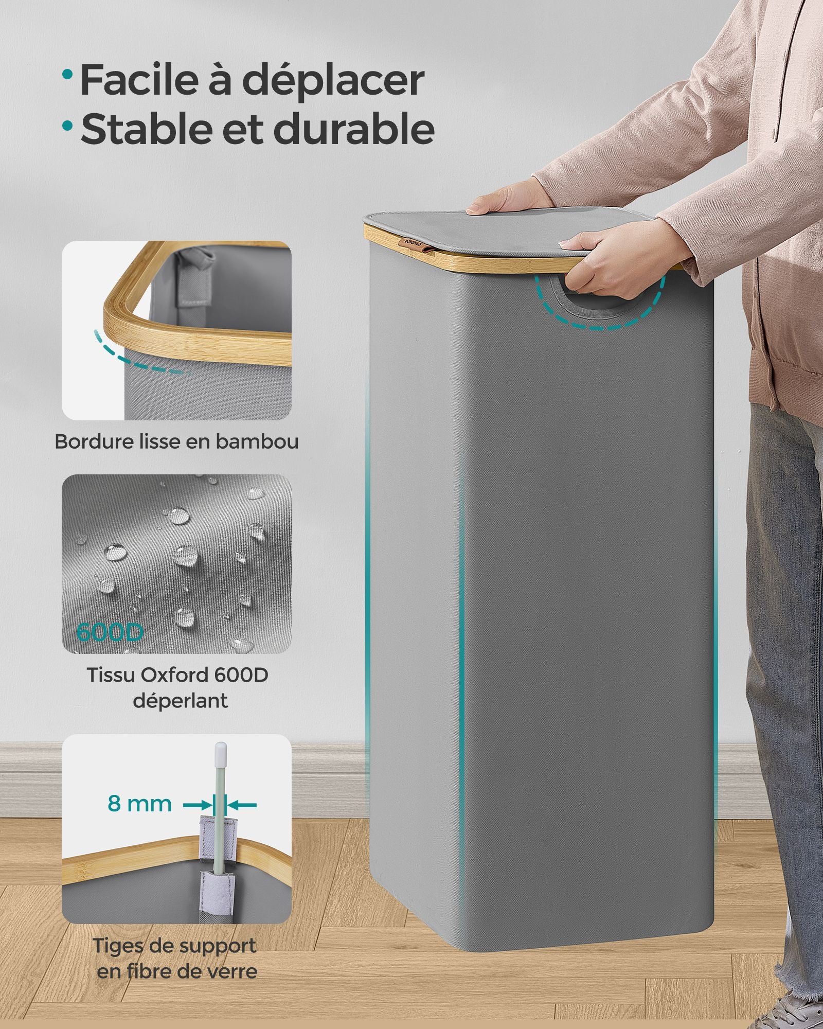 Panier à linge mince avec couvercle 65 litres gain de place doublure en maille amovible tissu oxford poignées en bambou pliable gris 12_0006721