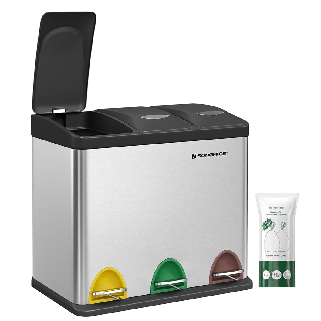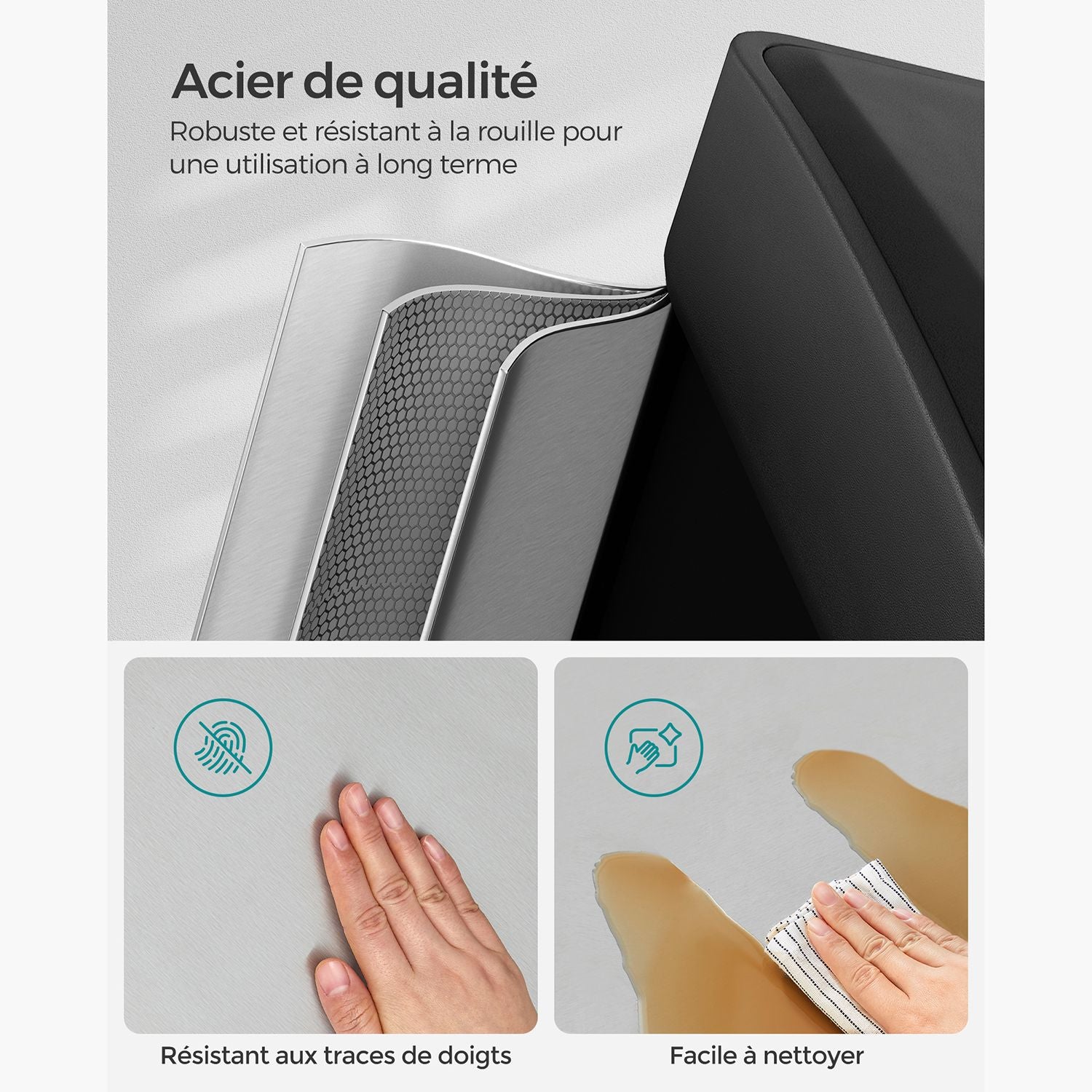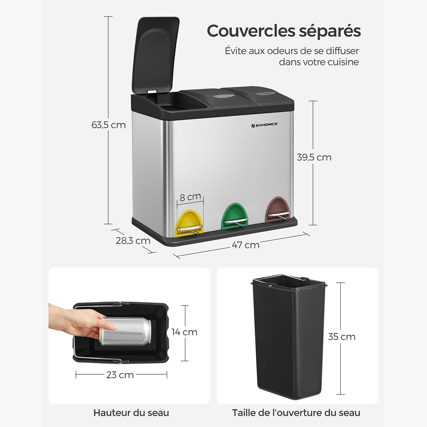Cette poubelle de tri sélectif en acier inoxydable allie solidité, praticité et design moderne. Avec ses trois compartiments intérieurs amovibles de 8 L chacun, elle offre une capacité totale de 24 L, idéale pour séparer facilement vos déchets et recycler au quotidien.