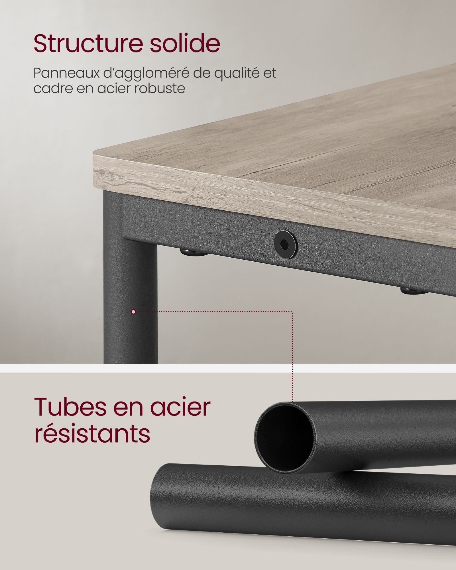 Conçue avec un cadre en acier robuste et des panneaux d’aggloméré de qualité, cette table allie solidité et stabilité. Elle peut supporter jusqu’à 100 kg, garantissant une utilisation fiable et durable au fil du temps.