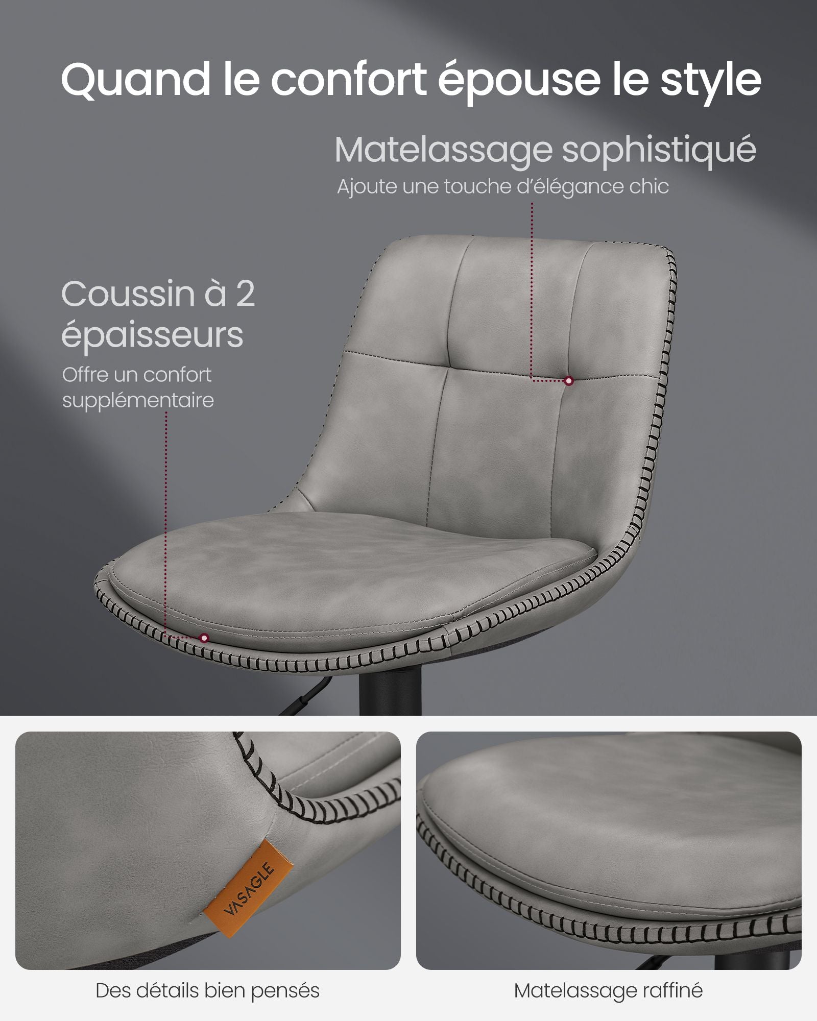 Pensés pour le confort, ils disposent de coussins moelleux à double épaisseur, d’un large repose-pieds de 32 cm et d’un dossier ergonomique. Chaque élément est conçu pour soutenir le dos et réduire la fatigue, même lors d’une assise prolongée.