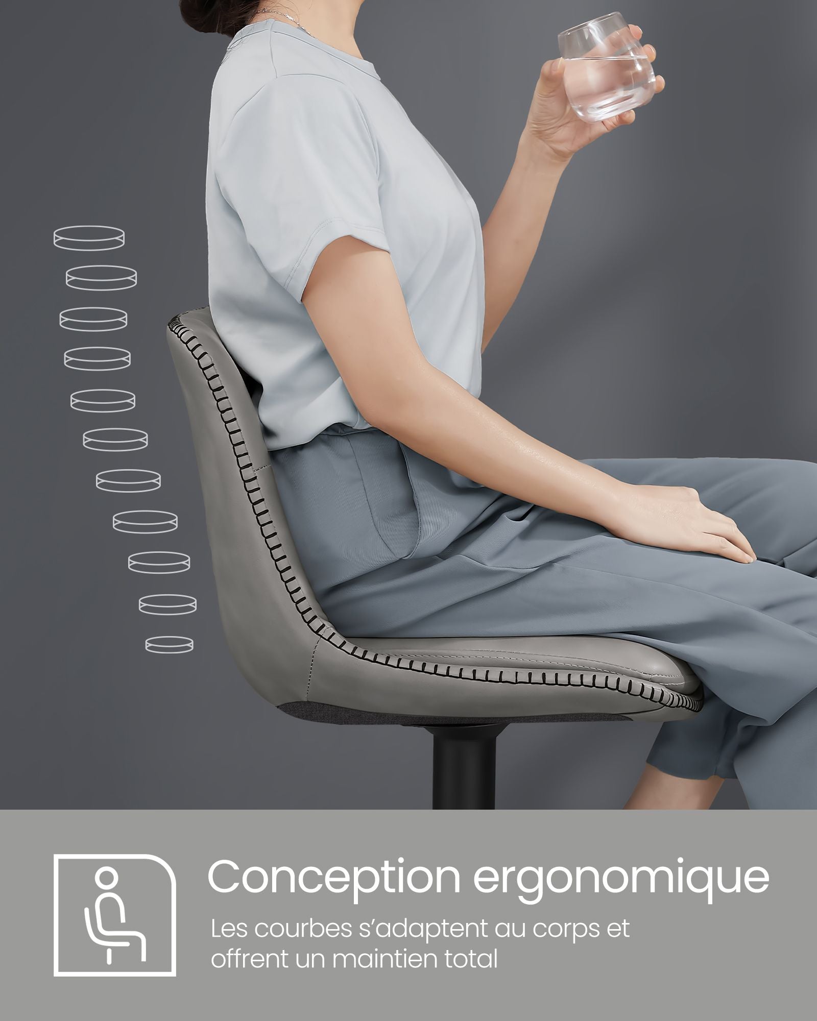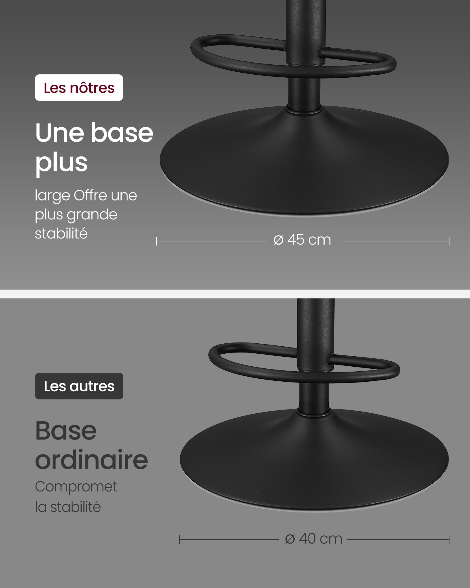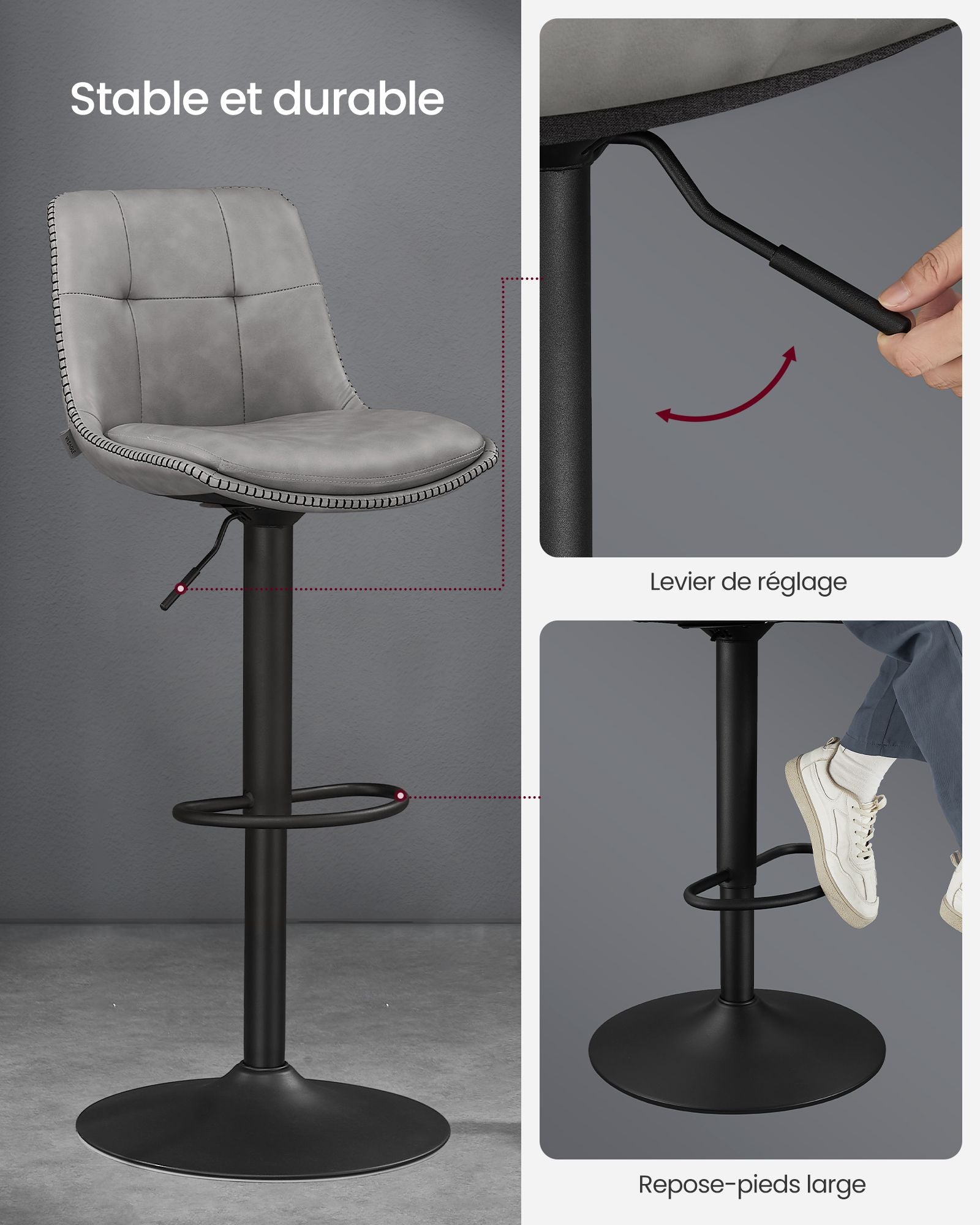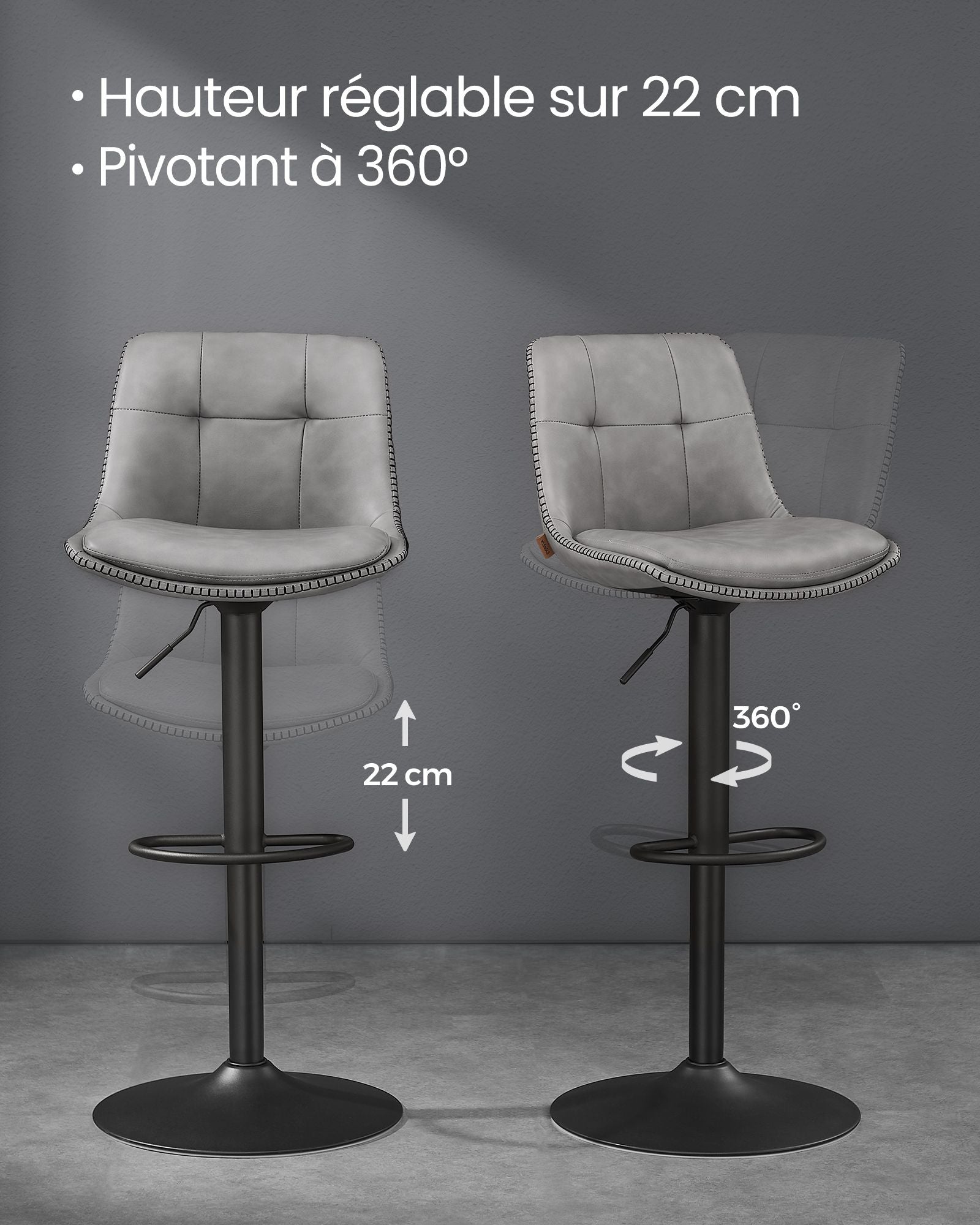La stabilité est assurée par une structure solide : un vérin à gaz de qualité, un cadre en acier chromé et une base robuste de 45 cm de diamètre. Chaque tabouret supporte jusqu’à 120 kg en toute sécurité, tout en permettant une rotation fluide à 360°.