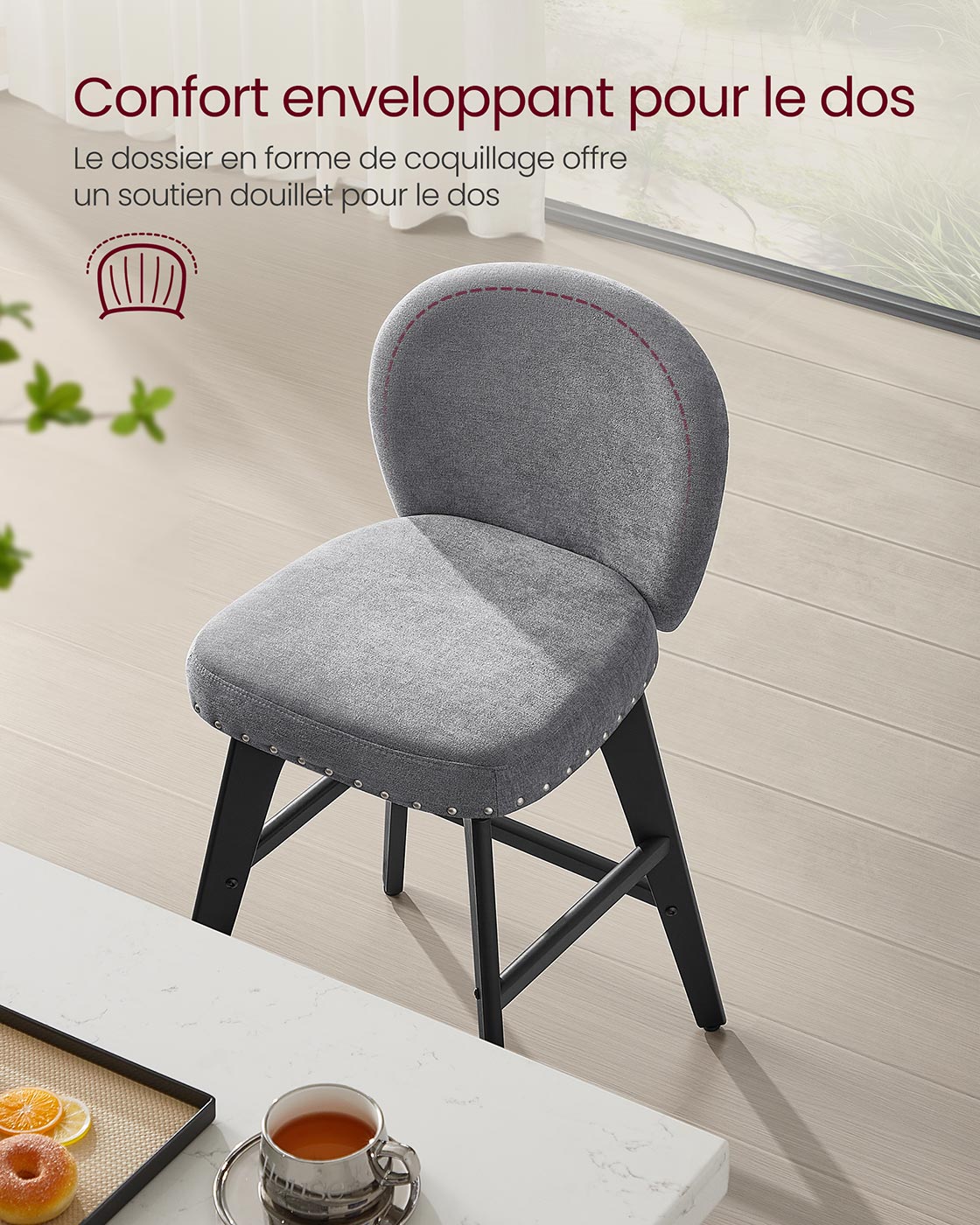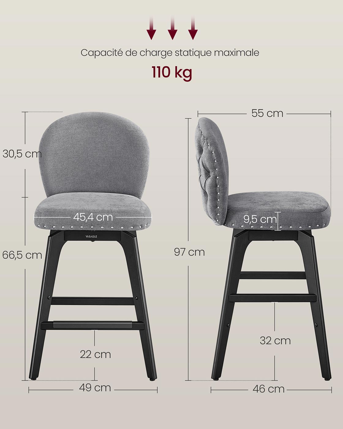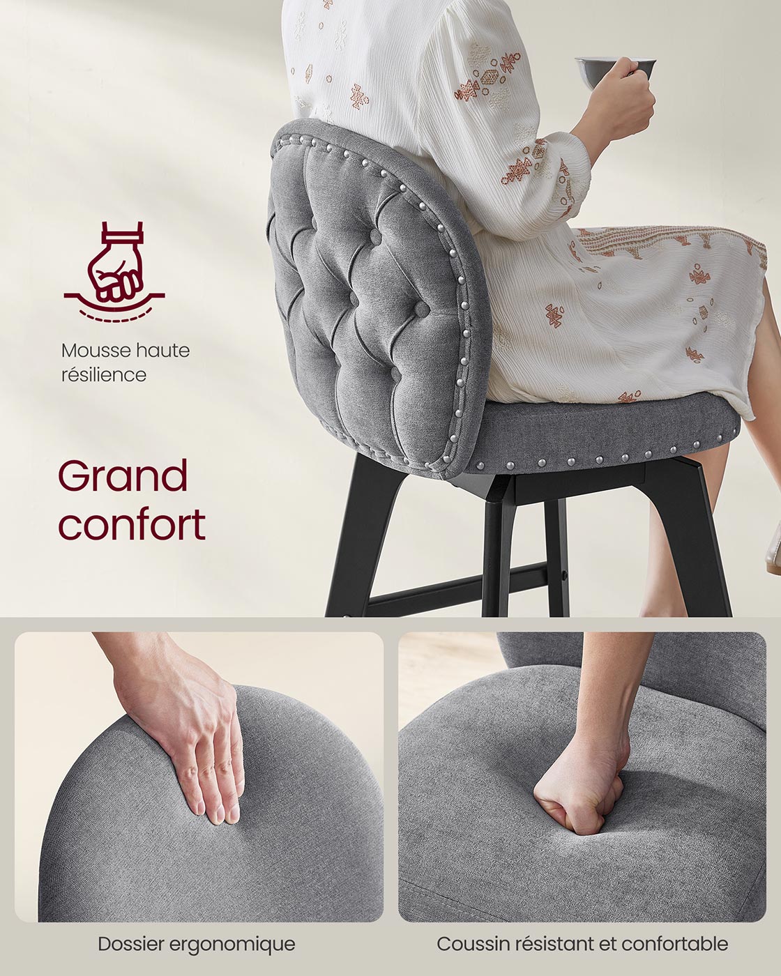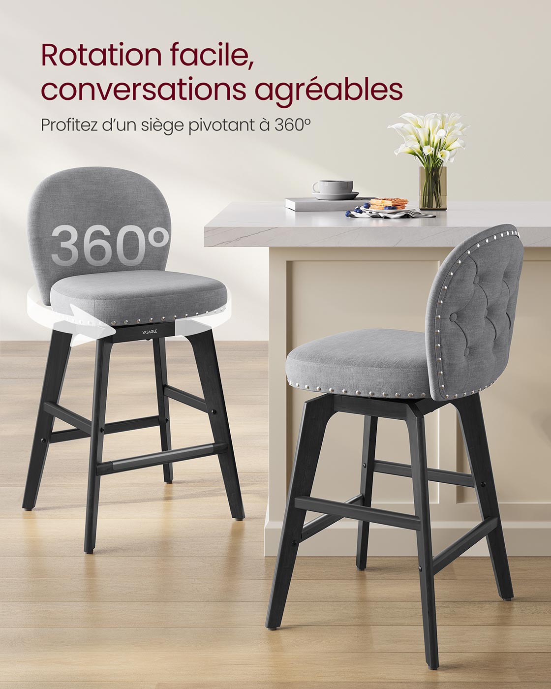 Tabourets de bar lot de 2 pivotants avec dossier et pieds en bois assise en tissu chenille hauteur d’assise 66,5 cm pour îlot central gris 12_0007989