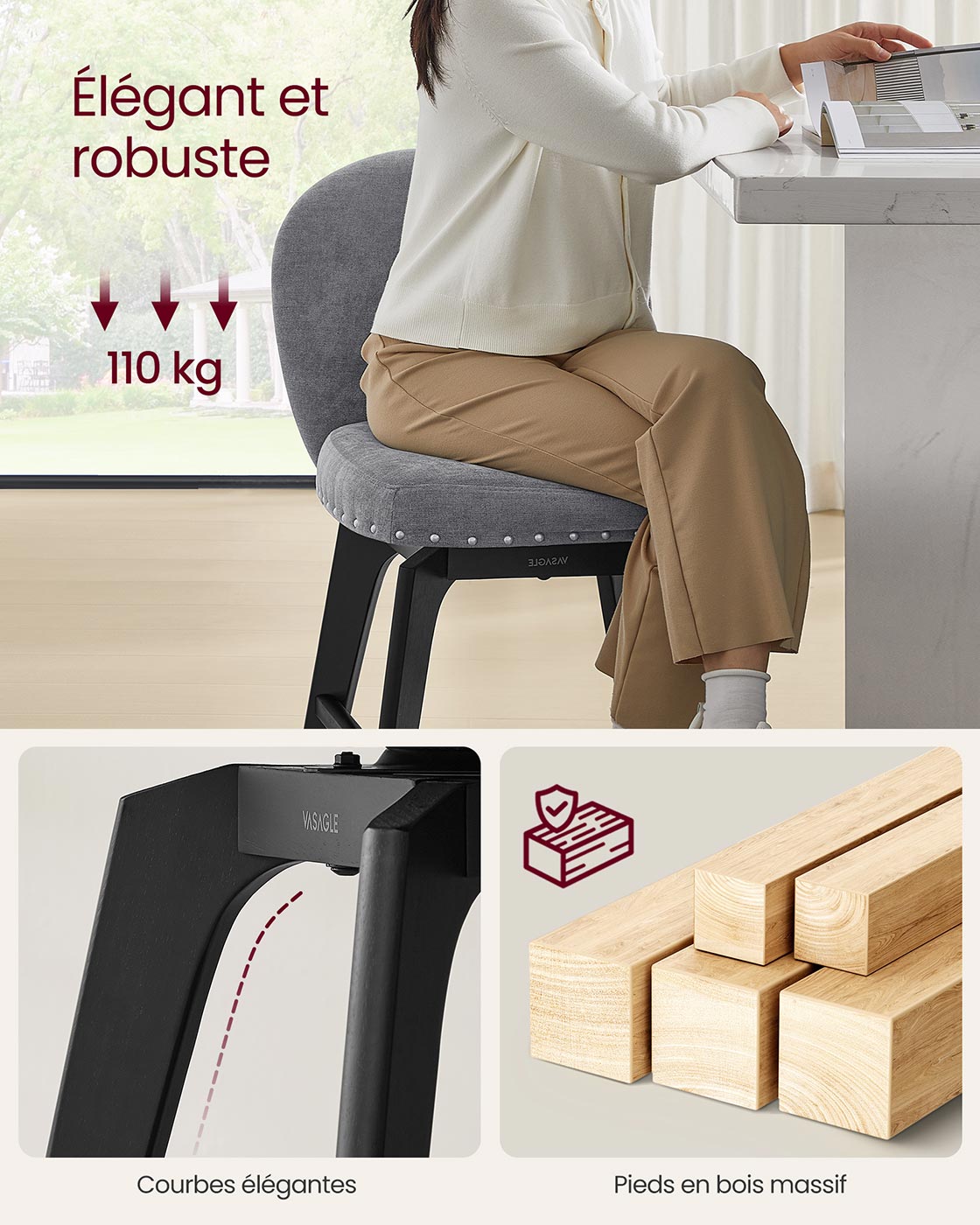 Solides et stables, chaque tabouret peut supporter jusqu’à 110 kg. Les pieds réglables garantissent une parfaite stabilité sans abîmer le sol, tandis que la protection métallique du repose-pieds assure une durabilité accrue.