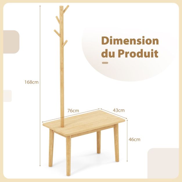 Table d'appoint avec porte-manteau en bois massif avec banc à chaussures 2 en 1 avec 3 crochets naturel 20_0009357
