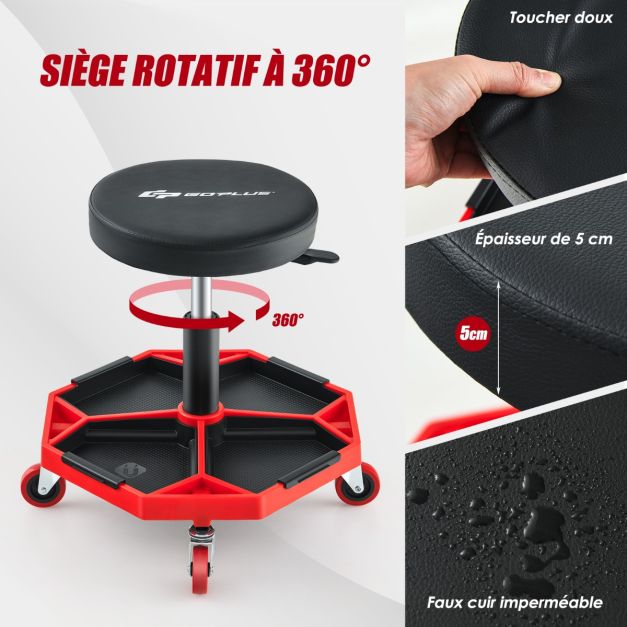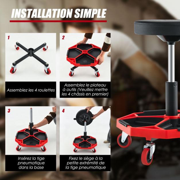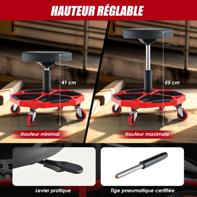 Tabouret d'atelier pneumatique avec 4 roulettes universelles plateau à outils siège rembourré capacité max 150 kg 20_0009476