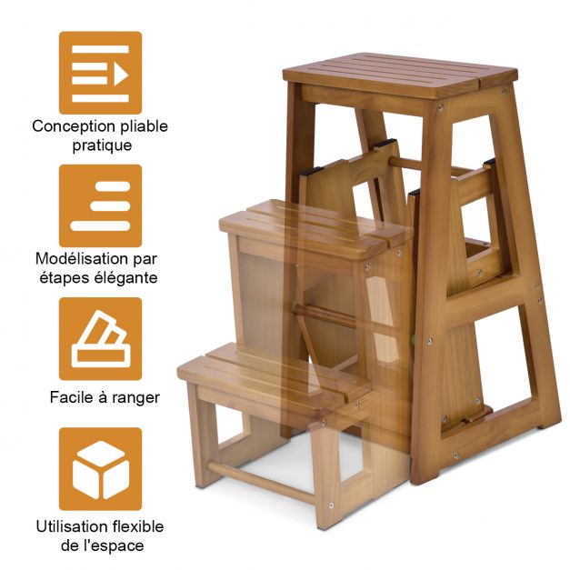Tabouret chaise pliante échelle de 3 niveaux tabouret escalier en bois multifonctionnel, 57 x 38 x 65 cm, naturel 20_0009475