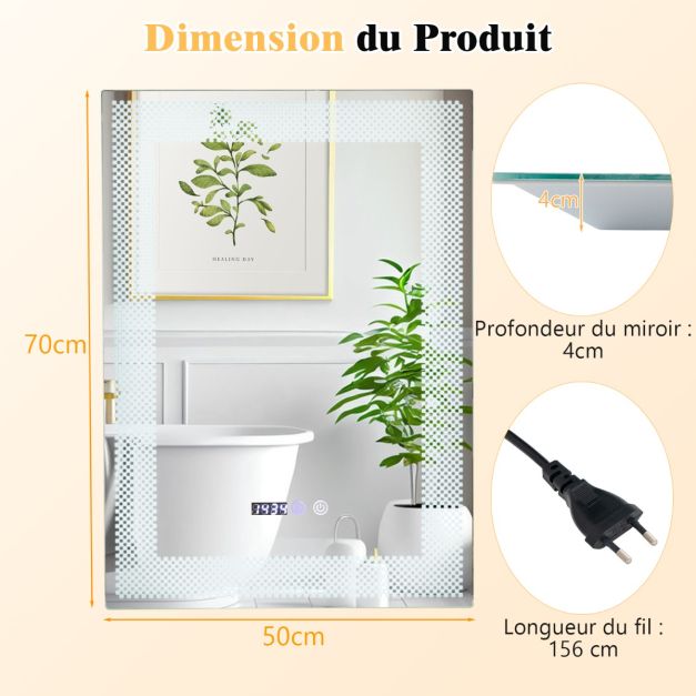 Miroir mural salle de bain led à 3 couleurs luminosité réglable fonction mémoire et de désembuage interrupteur tactile et affichage temps température 20_0005058