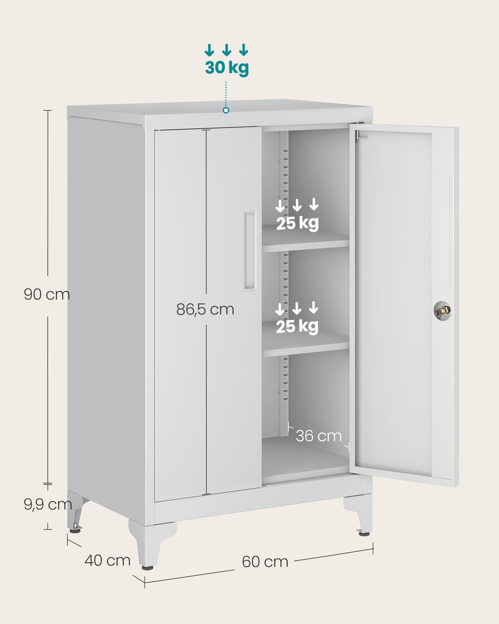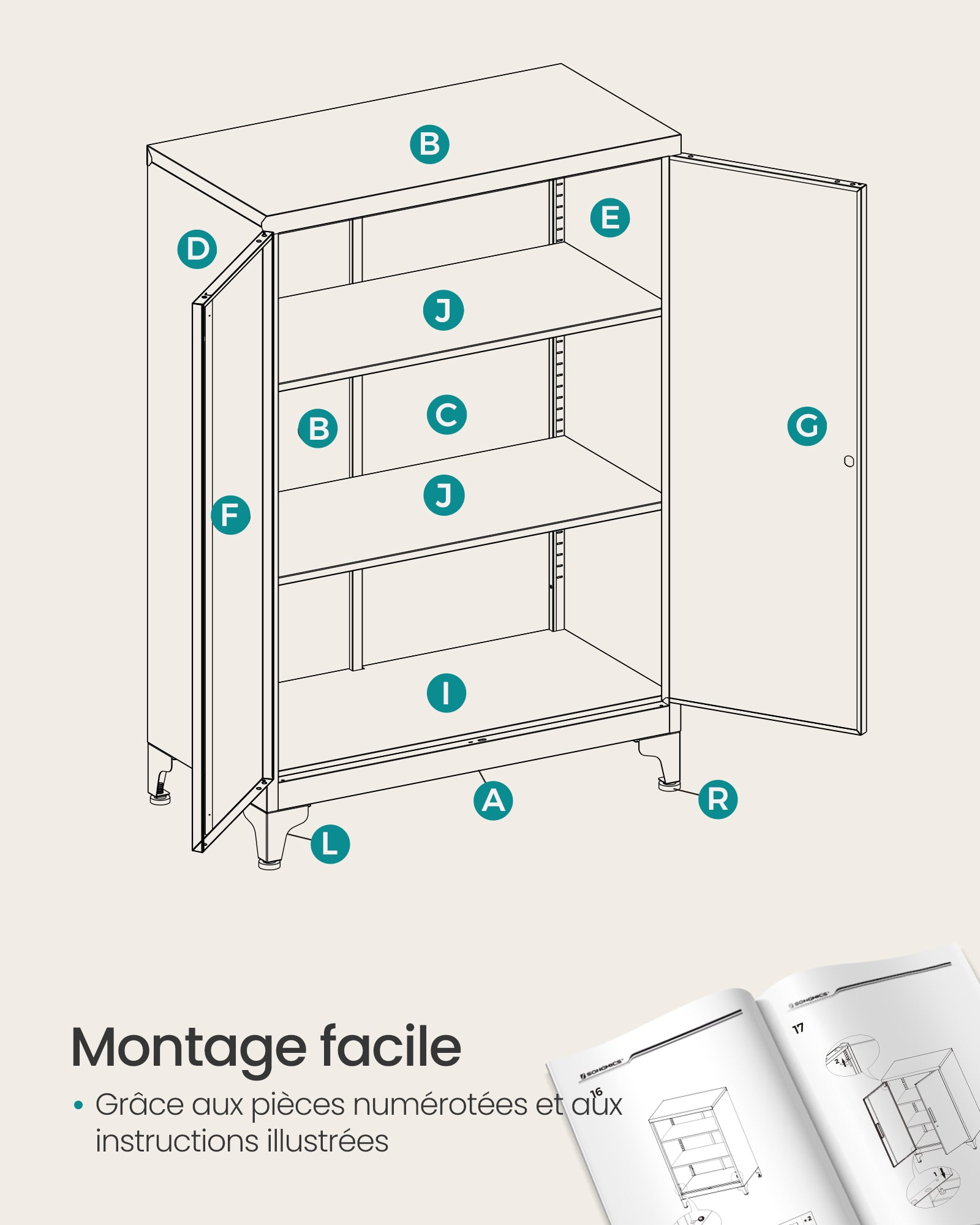Fabriqué en acier traité par poudrage, il est robuste, résistant à la rouille et conçu pour durer. Sa surface lisse et résistante à l’eau se nettoie facilement, conservant ainsi l’aspect neuf de l’armoire au fil du temps.