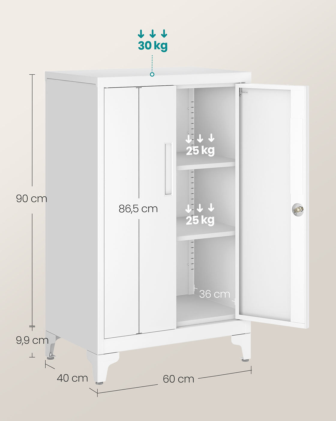 Caisson de bureau placard polyvalent 40 x 60 x 90 cm armoire de bureau à 2 portes verrouillable meuble de rangement en acier pour bureau salon blanc 12_0004834