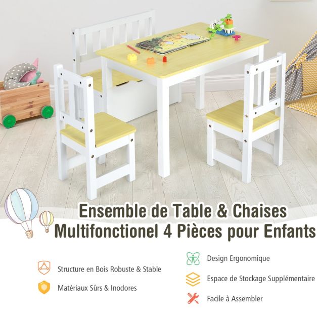 Ensemble de table et chaises pour enfant,avec table 2 chaises et banc de rangement 2 en 1 pour étudier et manger naturel 20_0007137