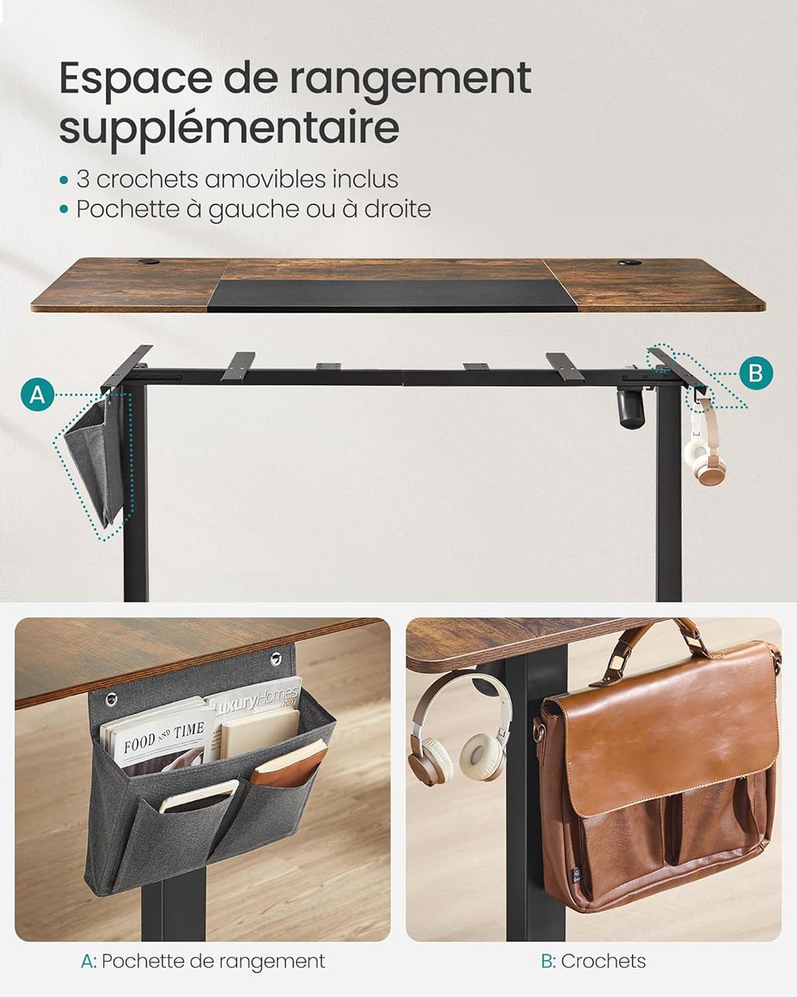 Dimensions du bureau : 140 x 60 x (72-120) cm (L x l x H)
