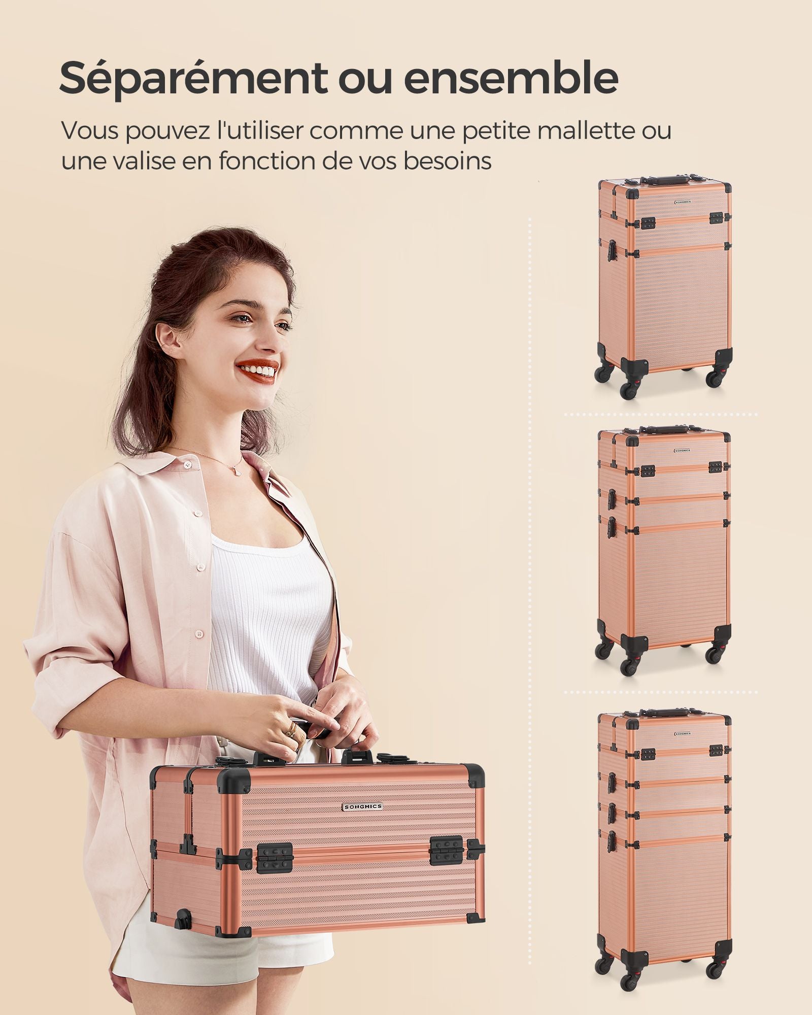 Vous pouvez utiliser l’ensemble complet ou séparer les modules selon vos besoins : la petite mallette du haut, les compartiments intermédiaires et la grande boîte du bas sont tous indépendants et modulables.