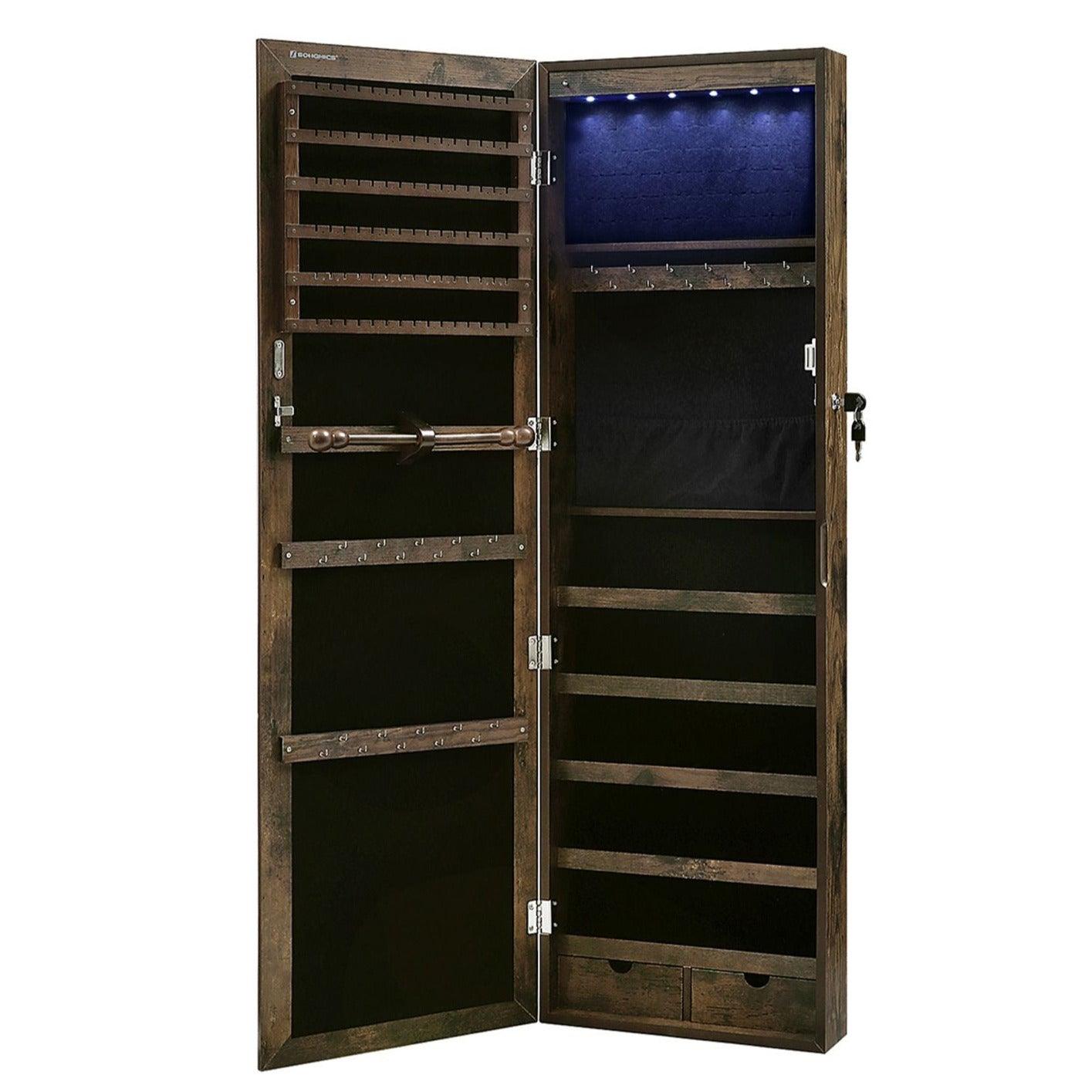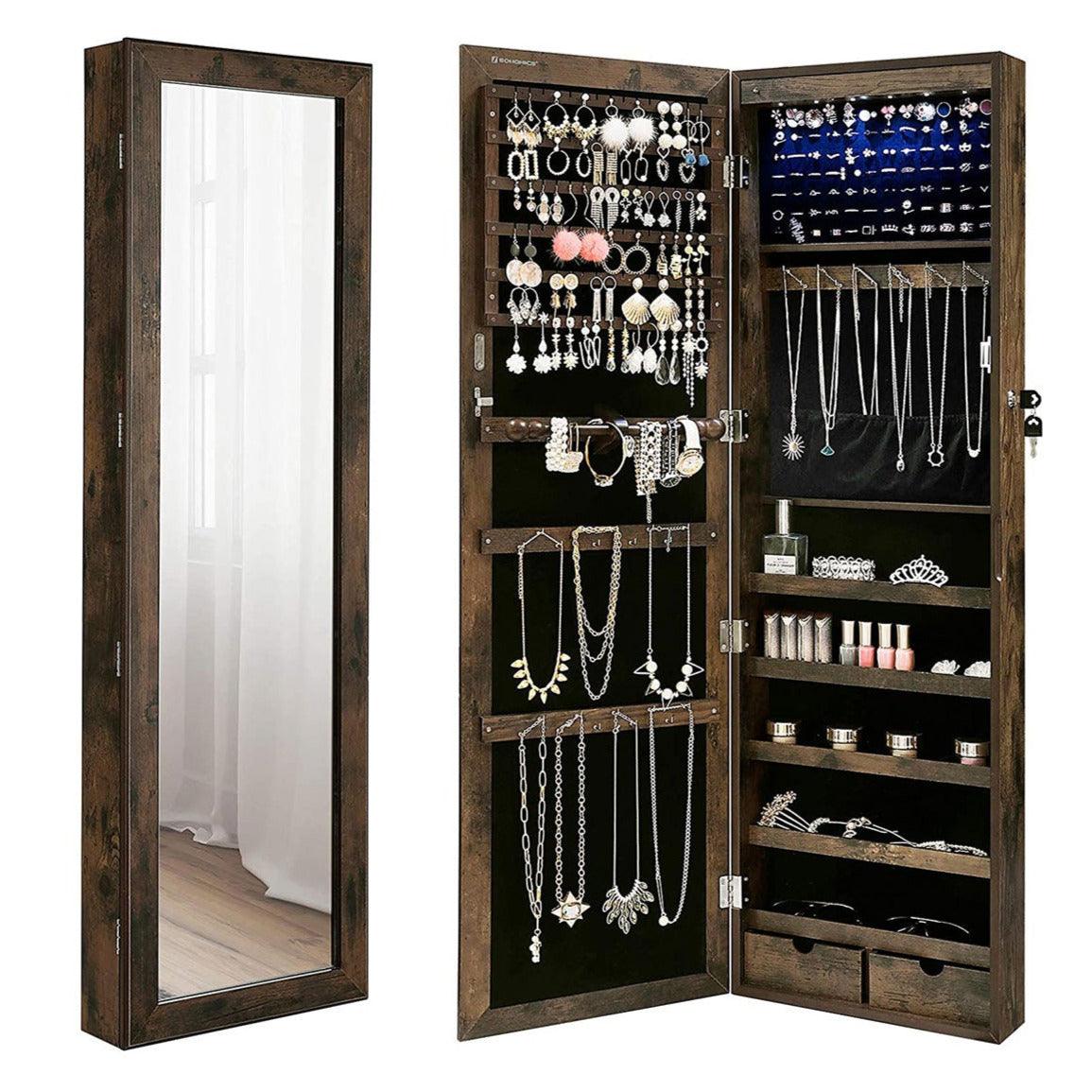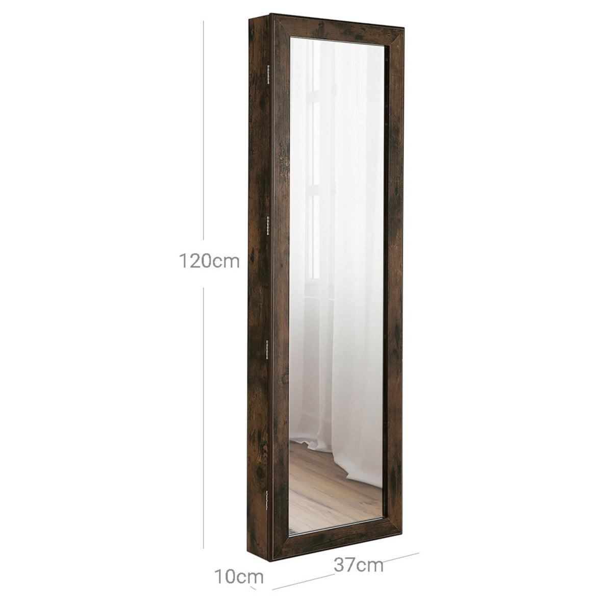 Armoire à bijoux meuble de rangement mural pour colliers boucles d’oreilles placard à accessoires avec miroir divers compartiments verrouillable 120 cm marron rustique 12_0002129