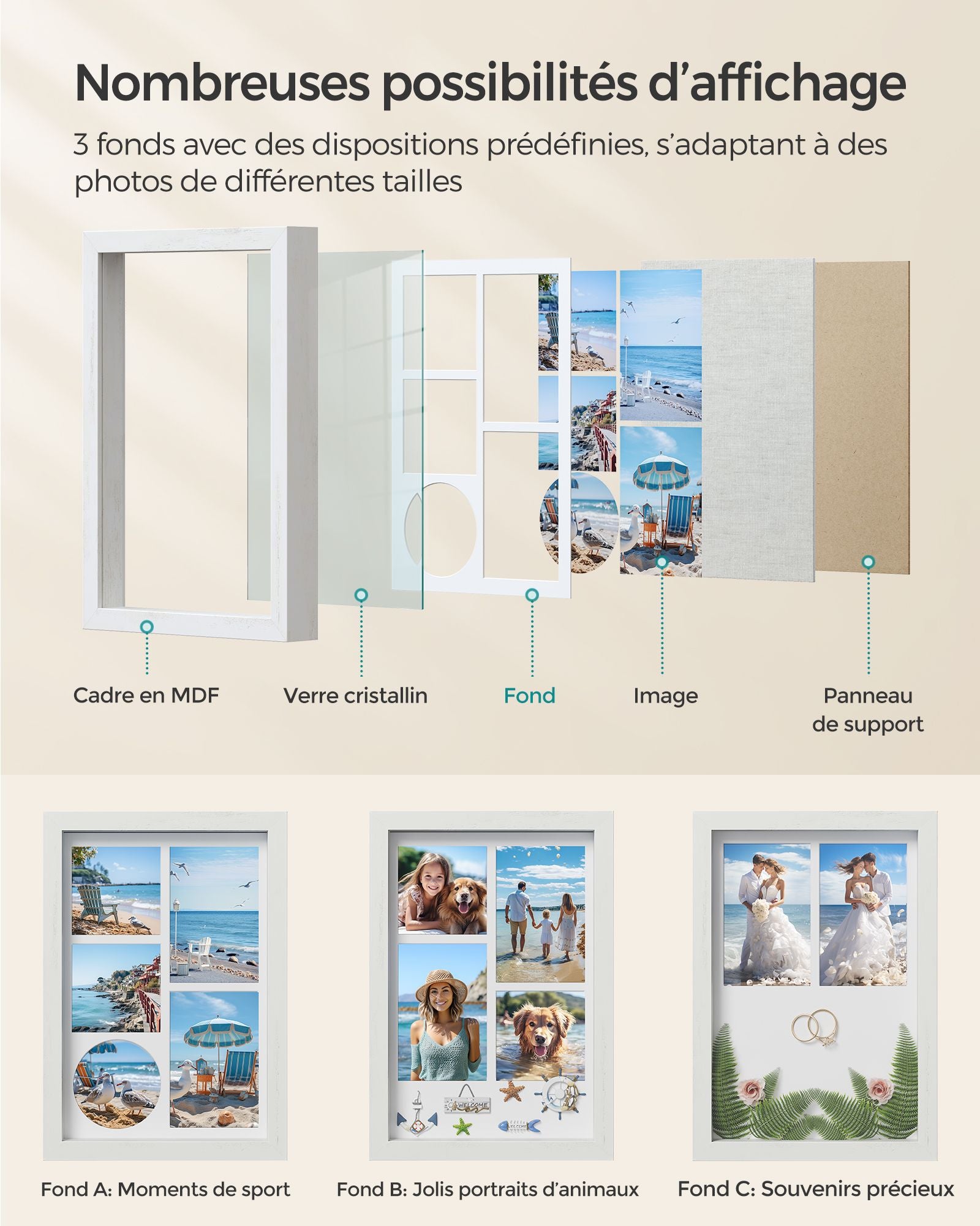 Il offre plusieurs options de mise en page grâce à ses 3 fonds prédéfinis, ses ouvertures variées et son panneau DIY avec punaises en bois. Vous pouvez ainsi personnaliser l’agencement de vos photos selon vos envies.