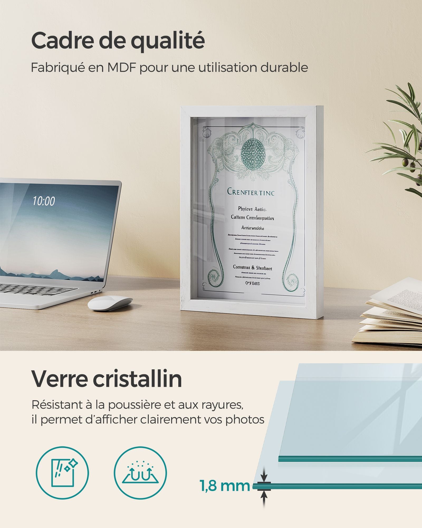 Fabriqué en MDF solide et équipé d’un verre cristallin, il protège efficacement vos photos et objets contre la poussière et les rayures. Le panneau arrière, recouvert d’un tissu façon lin sans acide, garantit une bonne conservation des images sans risque d’altération.